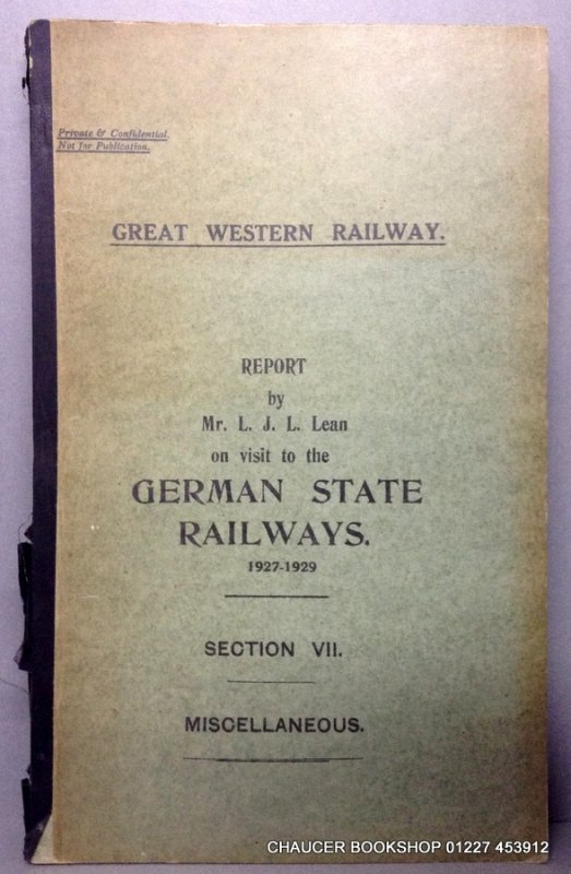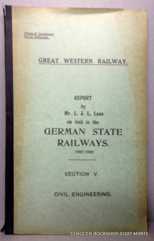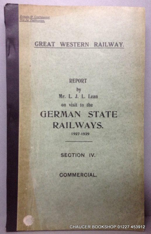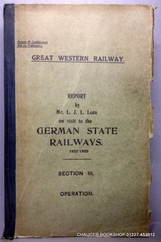 GREAT WESTERN RAILWAY: REPORT BY MR. L. J. L. LEAN ON VISIT TO THE GERMAN STATE RAILWAYS. 1927-1929 (4 of 7 Sections only) Section III: Operation; Section IV: Commercial; Section V: Civil Engineering; Section VII: Miscellaneous. Private & Confidential. Not for Publication.