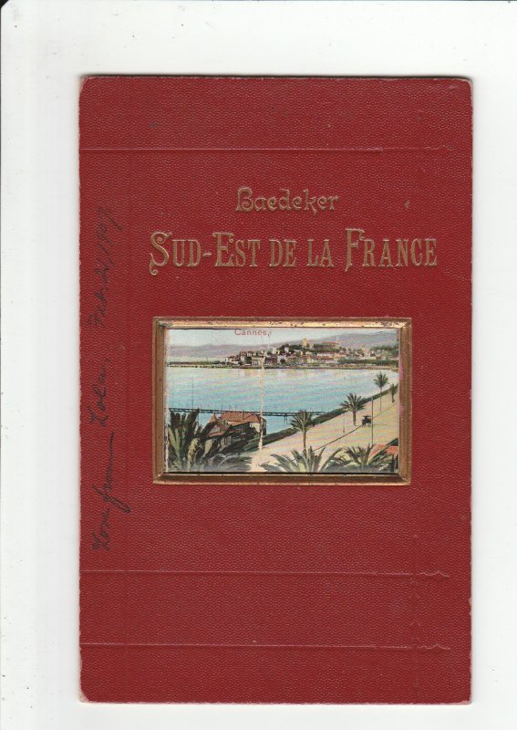 Small 8vo. postcard with one side made to look like a Baedeker Guide in dark red cloth, gilt, with a gilt edged frame cut out, showing a colour view of Cannes. Rear of postcard appears normal with a French 10 centime stamp which has been franked with the postmark reading "Cannes 1907". At some point the two sides of the postcard have been glued together but are becoming unstuck at one end, revealing that the colour view of Cannes is the front cover of a concertina-folding set of views, the others being in b/w. Ink inscription on front of postcard reads "Love from Lola, Feb. 21, 1907".Vertical crease to colour view. Light wear to edges and some soiling to rear of postcard. Overall an interesting curiosity in Good Condition.