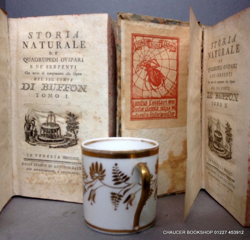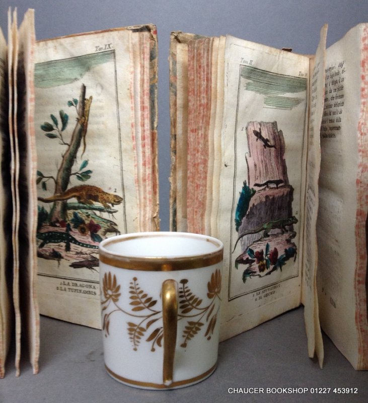 Two Volumes. TEXT IN ITALIAN. 12mo. hardbacks, half-bound with vellum spines and marbled paper-covered boards. Titles hand-lettered in ink on spines. All edges speckled in orange. 360 and 384pp. Possibly some pages missing at end of Volume II. Both volumes illustrated with rather crudely but contemporary hand-coloured engravings. 19 of 24 plates present. Attractive bookplate of Carolus Casolari (see image) to inside front cover of each volume along with an old library label. Some occasional foxing, heavier to prelims. A little (old) worming to spine edges and light soiling to boards. Overall a Good Interesting Set.