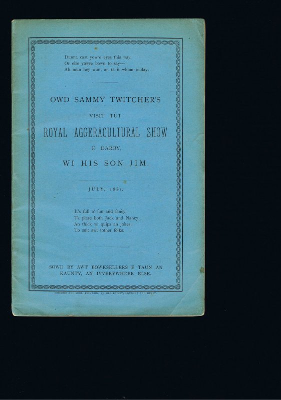 FIRST EDITION 8vo. stapled booklet with card covers. 28pp in dialect with b/w illustrations + 5pp contemporary adverts. A clean copy with no previous owners' markings or inscriptions. Bottom right hand corner of title page is ripped, covers are faded at the edges and there is slight soiling on the front cover. Overall, A Good Copy.