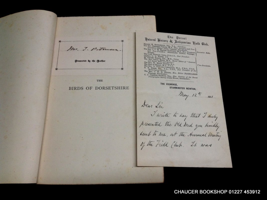 FIRST EDITION, PRESENTATION COPY WITH LOOSE LETTER FROM AUTHOR. 8vo. dark red brown clothbound hardback, gilt with gilt illustration of seabird to upper board. 179pp., illustrated with b/w engravings by G. E. Lodge within the text. "Presented by the Author" bookplate, addressed to Mr. J. Pitman on half-title page and loose letter, written and signed by the author, on Dorset Natural History & Antiquarian Field Club headed notepaper to the same Mr. J. Pitman (dated 1911). Previous owner's bookplate to inside front cover and another previous owner's name and address in pencil to early blank. Occasional light foxing, heavier to prelims. Light rubbing and wear to edges. Overall a VERY GOOD COPY.