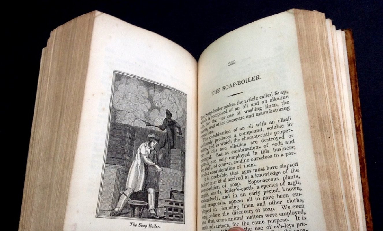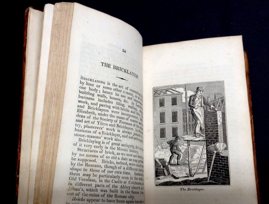 Tenth Edition. Small 8vo. rebound in full calf, using original boards, with black title label, gilt to spine. 454pp. plus 18pp. Questions at rear. Illustrated with 72 woodcuts of 76 trades plus 12plates of machinery at end. A clean copy with no previous owners' markings or inscriptions. Inner hinge between frontispiece and title page weak. Original boards rather scuffed and edgeworn. Overall a VERY GOOD COPY.