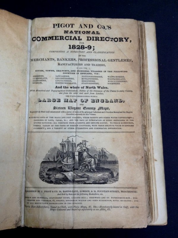 PIGOT AND CO.'S NATIONAL COMMERCIAL DIRECTORY FOR 1828-9 Comprising a Directory and Classification of the Merchants, Bankers, Professional Gentlemen, Manufacturers and Traders in all the Cities, Towns, Sea-ports, and principal Villages in the following Counties in England, viz: Cheshire, Cumberland, Derbyshire,