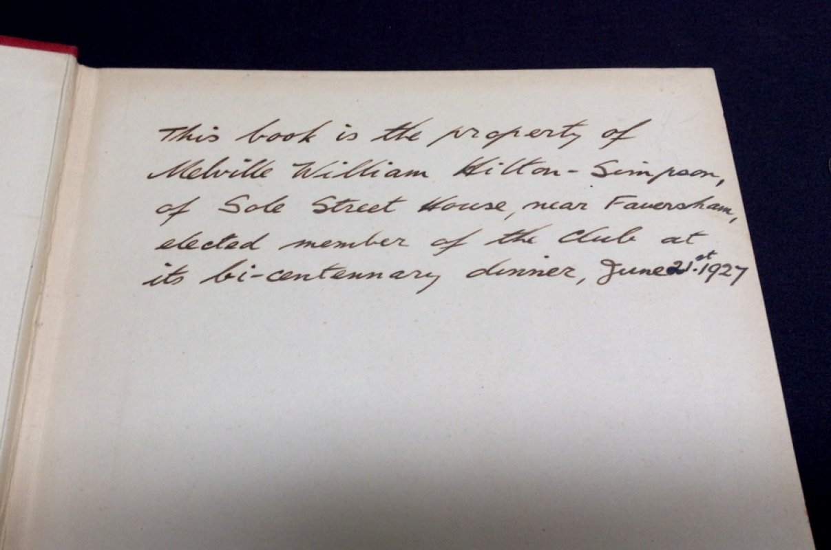 FIRST EDITION 4to. red clothbound hardback, gilt. 168pp, black & white frontis and 10 other b&w plates, plus foldout genealogical tables. Ink ownership inscription of Melville William Hilton-Simpson, elected member of the Club at its bi-centenary dinner, June 21st, 1927 to ffep. One ink correction, in same handwriting, to text. Binding a little slack. Occasional light foxing. Covers rather faded and soiled with light edgewear. Overall a Good Association Copy.