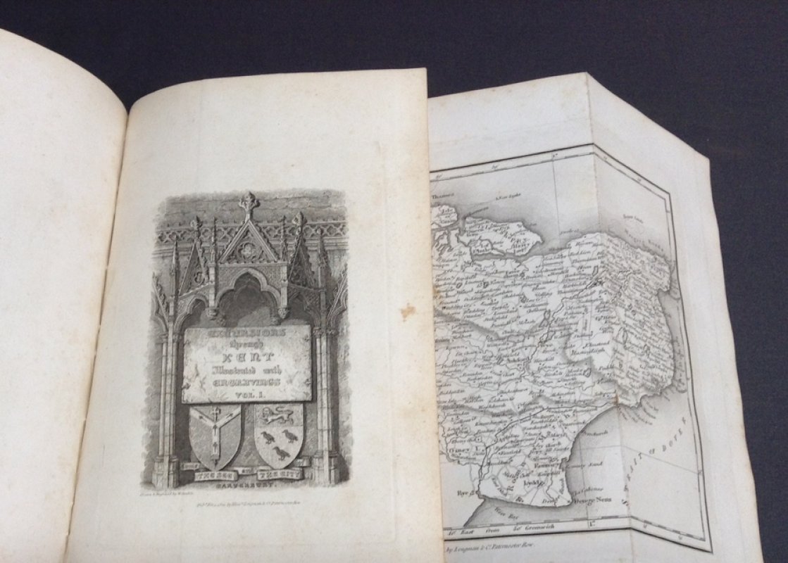 8vo., bound in half calf gilt over marbelled boards; Cornwall Volume: foldout b/w map + engraved half-title + [xi] + 164pp + 7pp index + 1pp list of plates + 48 engravings; Kent Volume: engraved half-title + [iv] + foldout b/w map + 189pp + 3pp index + 46 b/w plates. [NB: Title Page in each Volume calls for 50 engravings, but each contains 48 and 46 plates respectively, as usual). Previous owner's modern armorial bookplate to front pastedown, together with another previous owner's small bookplate and third owner's name and inscription in pencil,plus a fourth owner's pencil name and inscription to rear pastedown; occasional foxing, browning and handling marks throughout, including to both maps. Covers a little rubbed and edgeworn, head of spine scuffed. Overall a Good+ copy.