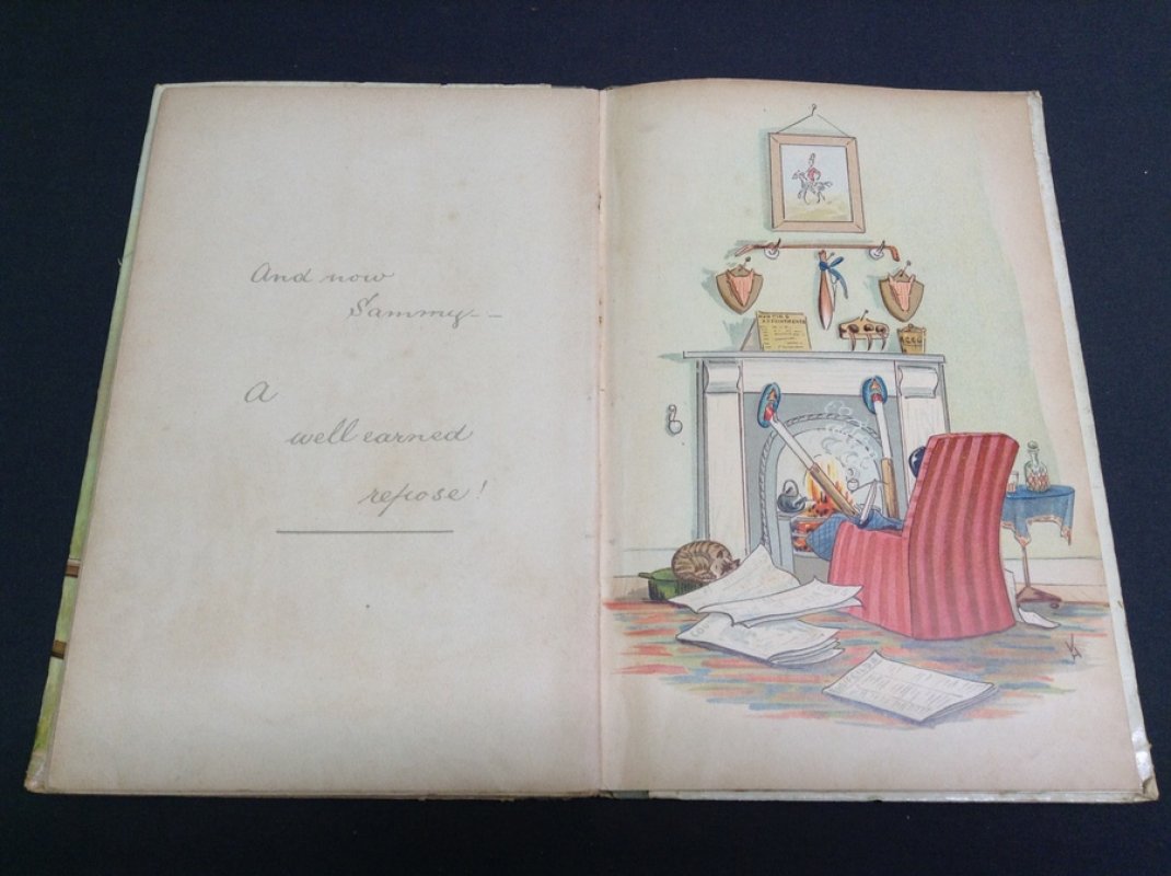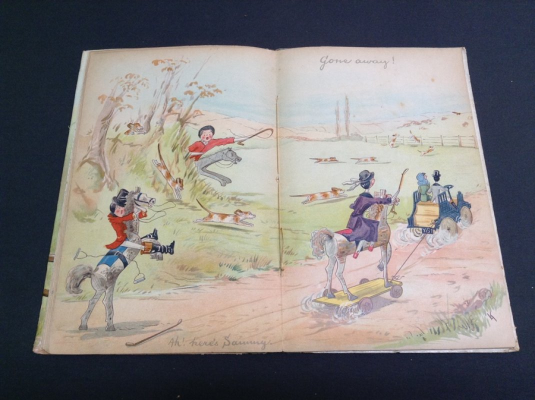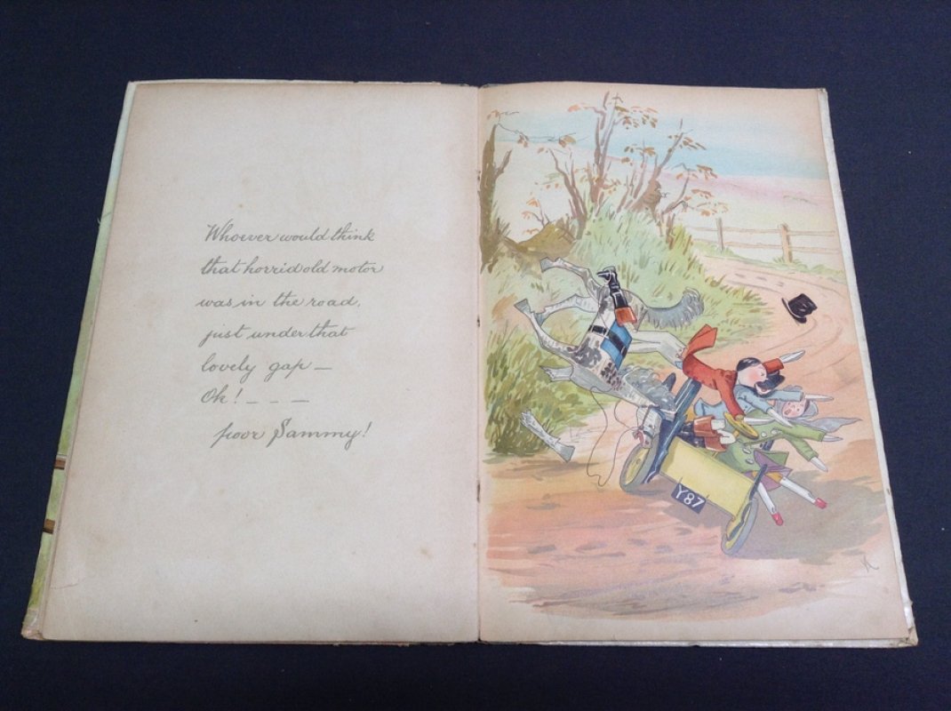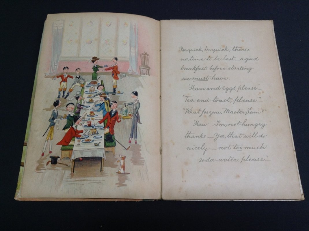 FIRST AND ONLY EDITION 8vo. hardback with grey buckram-bound spine and glazed boards, the upper illustrated in colour lithography. Illustrated endpapers. 24pp. featuring handwritten story printed in pale grey facing full page colour lithographed illustrations by the author, plus a double page colour spread in the centre. Neat ink name to blank facing title page. Light foxing and handling marks throughout. Sewn binding a little loose. Spine rather rubbed and boards lightly soiled with crease to top outer corner of upper board. Overall a GOOD COPY.