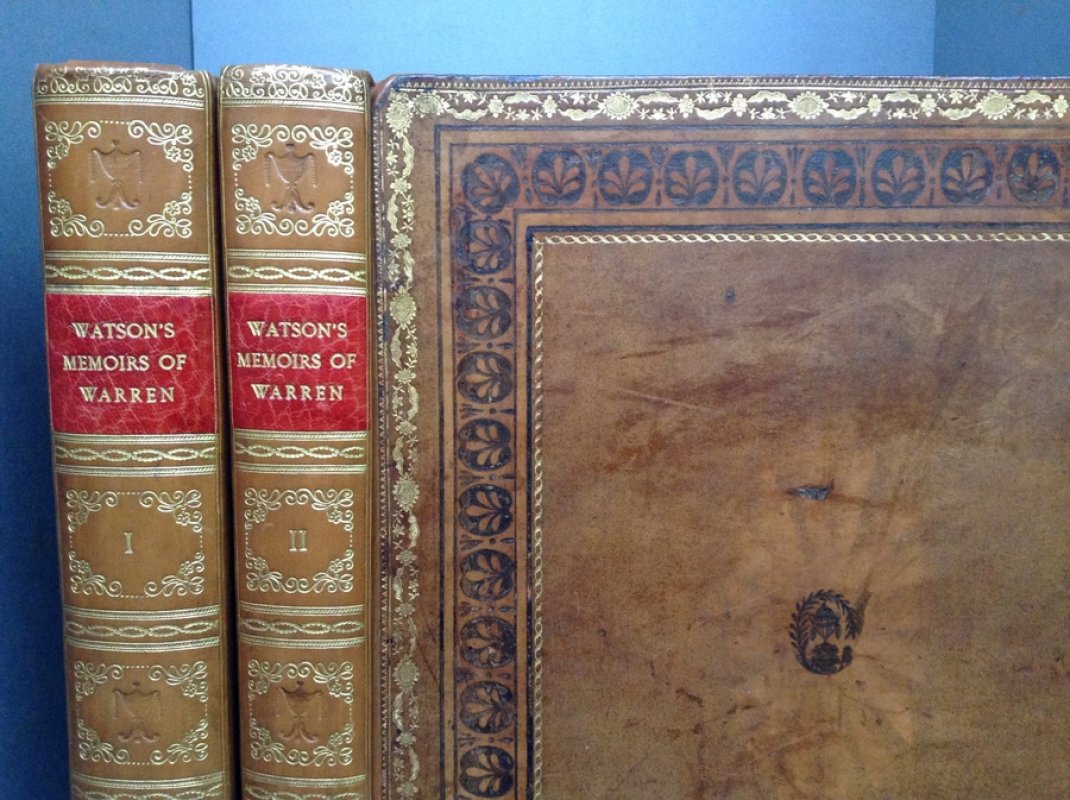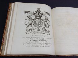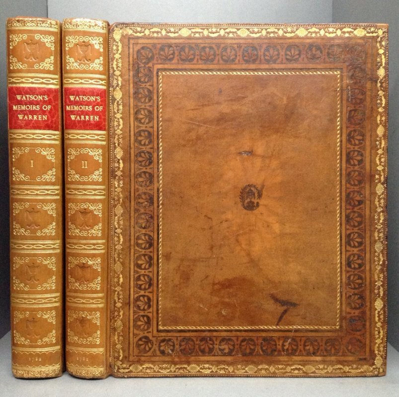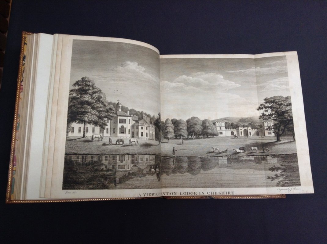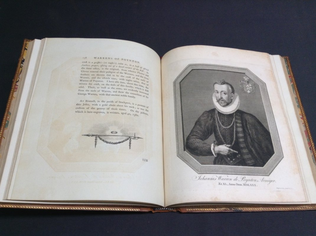 Third, Larger Edition. 2 Volumes. 4to. (approx. 29.5 x 24cm/11.75 x 9.75 inches) hardbacks bound in original Etruscan calf by Edwards of Halifax, spines skillfully rebacked during 20th century with raised bands, red morocco title labels, decorative gilt to compartments. Boards with highly ornate borders in gilt and blind-embossed Etruscan style and small floral-wreathed urns to board centres. Gilt dentelles, marbled endpapers and all edges gilt. Vol. I: vi + 304pp. + [6]pp. index and addenda. Vol. II: ii + 245pp. + [10]pp. index and addenda. Illustrated with 53 engraved plates (many by James Basire) including portrait frontispiece of author, large folding genealogical table (with closed tear) and three other folding plates, plus numerous armorial engravings and decorative head and tailpiece vignettes and initials within text. According to Lowndes, most copies lacking two folding plates, one of Earl Warren drawing his sword before the Commissioners of Edward I (mentioned p.251) and the View of Poynton Lodge, Cheshire. This copy lacks the former plate opposite p. 248 but does contain the one of Poynton (Vol. II). It cannot, however, be said to be incomplete as the publishing history of this title is so uncertain and both of these plates may not have been ready to issue when this early, 1782 edition, appeared. Engraved armorial bookplates of Robert Denison to front pastedown of each volume and elegant ink gift inscription (probably contemporary), from Thomas Jaques to Robert Denison to top of early blank in Vol. I. Occasional light offsetting from engravings. Slight ageing to prelims. Very light wear and rubbing to corners otherwise a VERY GOOD SET, BEAUTIFULLY PRINTED AND VERY HANDSOMELY BOUND.