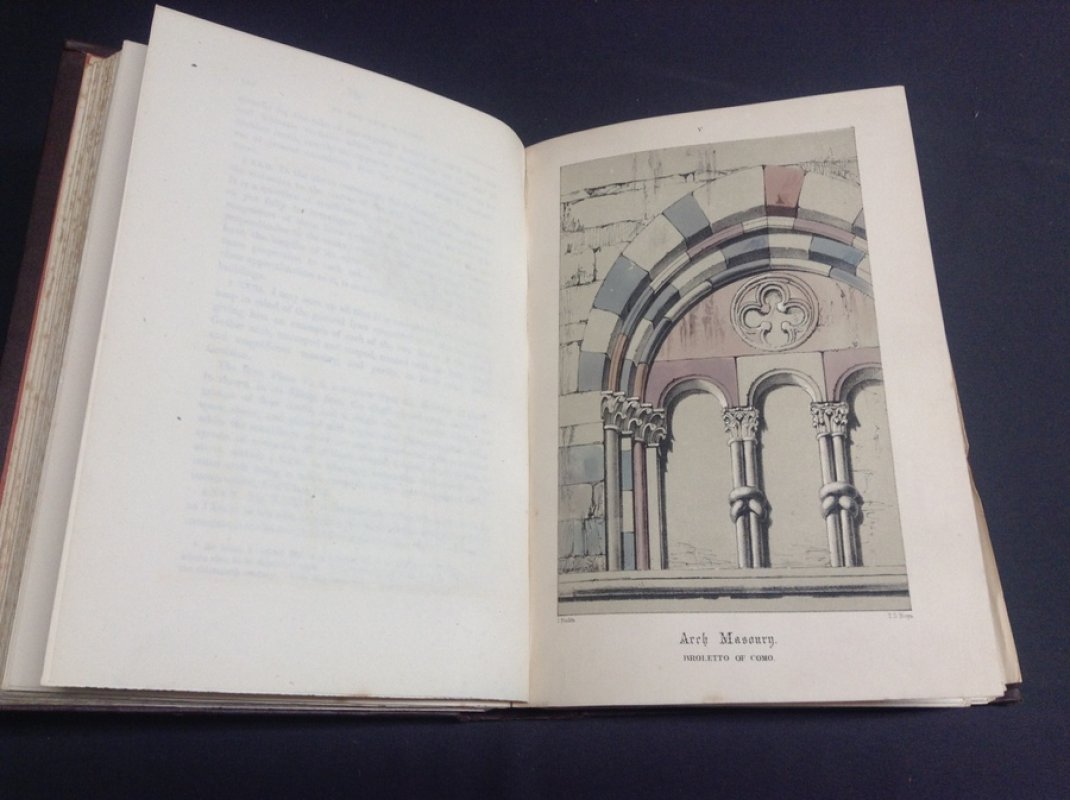 FIRST EDITIONS, FIRST IMPRESSIONS 3 Volumes. Royal 8vo. (approx. 27 x 19cm), uniformly bound in publisher's decorative brown cloth with gilt titles to spines, gilt decorations to all boards, and blind-embossed decoration all over. t.e.g. Volume I: 413pp. plus 2pp. Publisher's Prospectus for Examples of the Architecture of Venice and Volume II of The Stones of Venice at rear. Errata slip following List of Plates. Illustrated with 21 tissue-guarded plates (3 hand-coloured, 7 Sepia and 11 b/w) plus 72 figs. within the text. Volume II: 393pp. plus Publisher's 16pp. catalogue, dated September 1853, at rear. Illustrated with 20 tissue-guarded plates (2 hand-coloured and 18 b/w) plus 38 figs. within the text. Volume III: 362pp. plus Publisher's 16pp. catalogue, dated October 1853, at rear. Illustrated with 12 tissue-guarded plates (11 b/w and 1 blue monochrome) plus 4 figs. and 4 Gallery plans within the text. All volumes have the armorial bookplate of James Milnes Stansfield to front pastedown and his signature to ffep (also to top of title page of Vol. III). All volumes have occasional light foxing, mainly to foredges and plates of Vols. II and III. Vol. I has split hinge between main text and Publisher's prospectus, resulting in last few pages a little proud. Otherwise bindings nice and firm. First plate in Vol. III partly detached. Light wear to tops and bases of spines and corners otherwise a VERY GOOD SET.