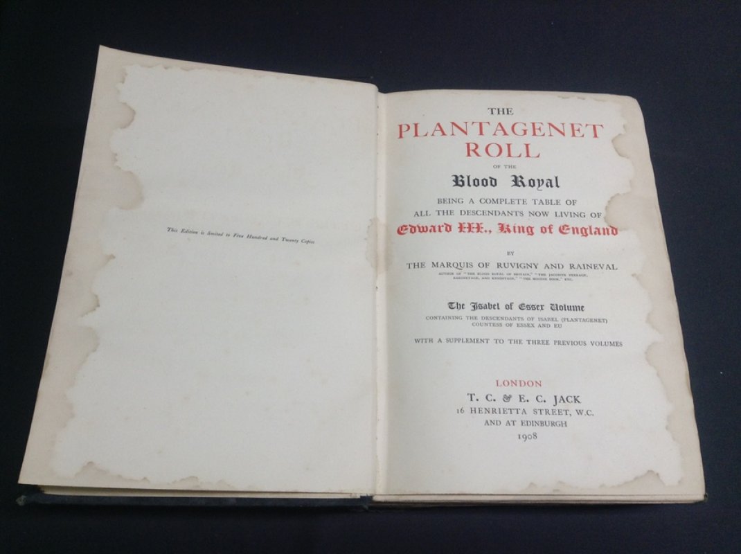THE PLANTAGENET ROLL OF THE BLOOD ROYAL Being a Complere Table of all the Living Descendants Now Living of Edward III, King of England. The Isabel of Essex Volume Containing the Descendants of Isabel (Plantagenet) Countess of Essex and EU with a Supplement to the Three Previous Volumes.