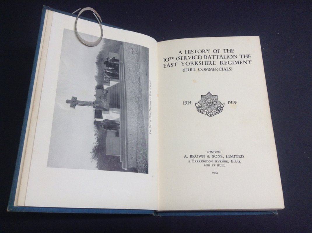 A HISTORY OF THE 10TH (SERVICE) BATTALION THE EAST YORKSHIRE REGIMENT (HULL COMMERCIALS) 1914-1919 (Assocation copy presented by one of the authors, Thirsk, to his son and with annotations by the Author and his son)