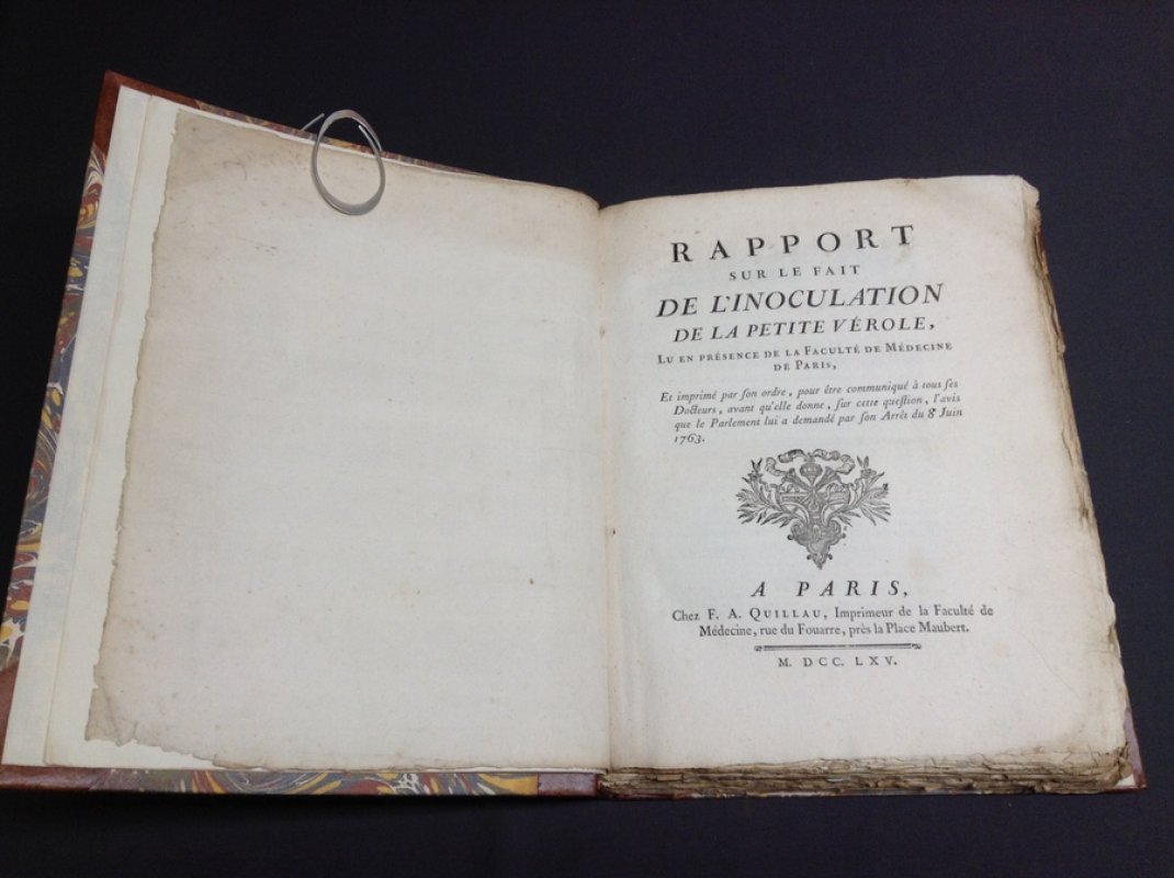 Rapport sur le fait de l'inoculation de la petite v Et imprime par son ordre, pour etre communique a tous ses Docteurs, avant qu'elle donne, sur cette question, l'avis que le Parlement lui a demande par son Arret du 8 Juin 1763.