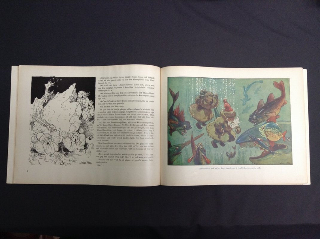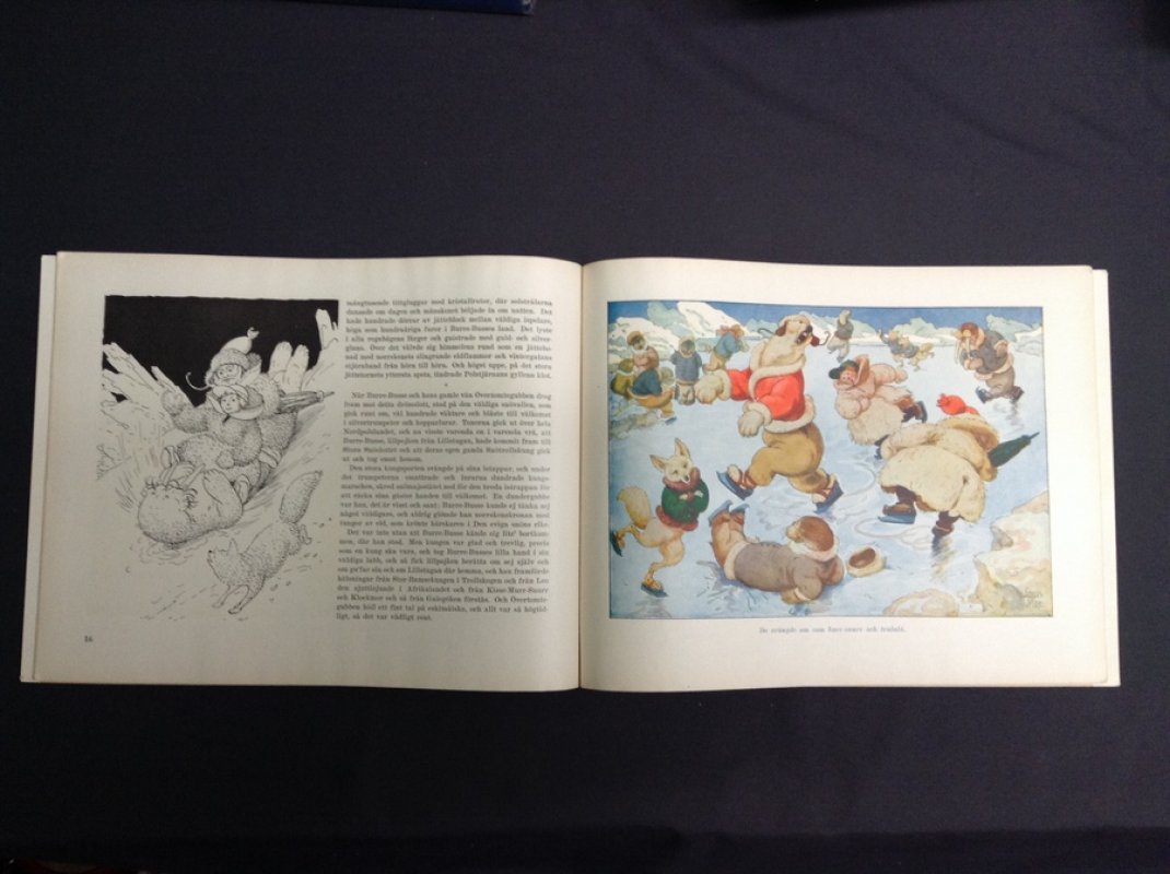 Undated but c.1942. Landscape 4to hardback [31 x 24.5] in colour pictorial paper-covered boards, with blue cloth spine; 25pp, with full page illustrations throughout in colour and b/w. Text in Swedish. Clean copy with no previous ownership inscriptions or annotation. Some handling marks, edge wear and light soiling to boards and spine. Overall a VG copy.