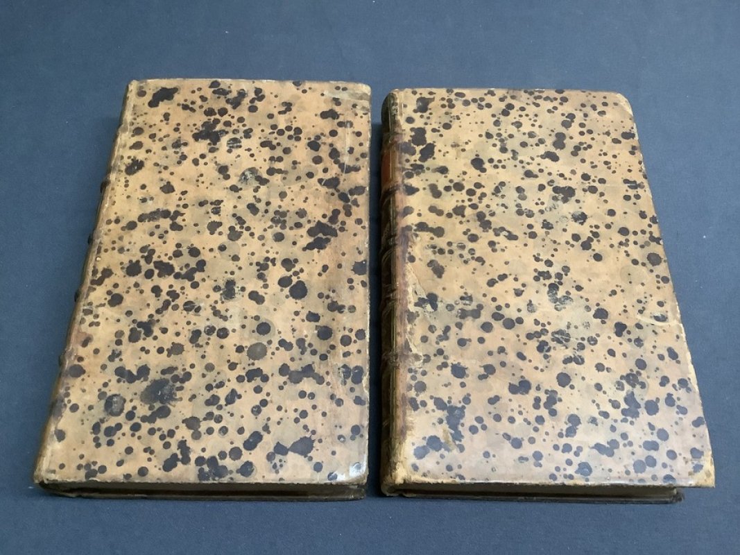 Fourth Edition, in Two Volumes. Small 8vo. (approx. 17 x 10cm) hardbacks in full 18th Century calf with raised bands, terracotta title labels, highly decorative gilt to spines, and decorative mottling to boards (please see photos). 324pp. and 303pp. plus 30pp. Lists of Authors and Plays at end. Vol. I has engraved portrait frontispiece after Vanloo. Faint ink initials to front pastedown of both volumes. Vol. I lacking rfep. Vol. II has creasing to top corner of last few pages. Occasional light foxing, mainly to prelims. Slight rubbing to gilt and light wear to top and bases of spines. Overall a GOOD+ HANDSOME SET,
