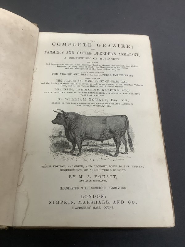 Tenth Edition, enlarged, and brought down to the present requirements of Agricultural Science. 8vo. faded green cloth hardback with decorative gilt titles to spine, gilt bull to upper board and blind-embossed decoration to boards; [viii] + 718pp including index + 16pp. publisher's catalogue at end. With many b/w engravings within the text. Ink gift inscription, dated 1864, to ffep and later green ink inscription to front pastedown. Occasional ink notes in margins. Blank facing title page removed. Binding a little stretched, but holding, with splits to front inner hinge. Occasional light foxing and light soiling to front endpapers. Binding rather faded and worn with a few small ink spots (please see photos). Overall a Good Sound Copy.