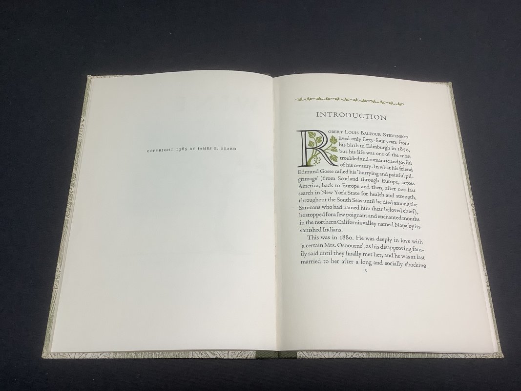 8vo., in quarter green cloth over green leaf patterened paper-covered boards, with glassine wrap; [x] + 12pp. Extensive ink gift inscription to ffep. A few tiny spots of foxing to rear endpapers, light sunning to edges of boards, glassine wrap a little sunned and edgeworn, slight soiling to rear. A VG copy overall.