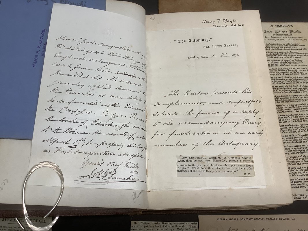 FIRST EDITION 8vo. brown pebble cloth hardback, gilt, with decorative blind-embossed borders to boards. Contains handwritten letter from the Editor of "The Antiquary" to Planche and Planche's handwritten reply pasted in at half title. Newspaper cuttings from The Illustrated Review, Friday, December 15, 1871 relating to Planche pasted in at Dedication page. Also contains a loose envelope with various newspaper cuttings, letters and a sketch with connections to Planche and Ash-next-Sandwich. 413pp., illustrated with woodcuts in text and b/w plates, including a map. Previous owner's bookplate to front pastedown and ink signature and date, 1917, to half title. Mauve rubber stamp name (same) to top of title page. Front and rear inner hinges have been strengthened with brown cloth tape. Light wear and rubbing to all edges and slight splitting to cloth at top and base of spine. Overall a Good Copy with associated ephemera.