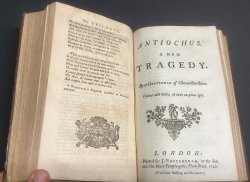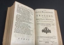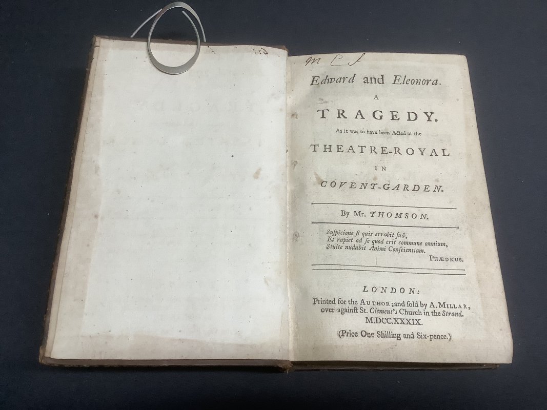 8vo. hardback in original 18th Century full calf, raised bands and decorative gilt to spine and boards. [8], 64pp.; viii, [2], 81pp., 4pp. Epilogue; 29pp.; 70pp., 2pp. Epilogue; [4], 68pp.; [4]83pp., 1pp. Epilogue. Cast Lists to first two and last plays. Contemporary ink number to front pastedown, initials to first title page and Author (Hawkins Browne) handwritten to title page of last play. Occasional light foxing and browning to some pages and slight offsetting from binding to prelims. Spine somewhat rubbed and worn and beginning to split at lower rear hinge. Overall a Good Copy. This is one volume of a large collection of uniformly bound mainly 18th century collections of plays (generally 4 or 5 per volume) from the collection of the Vaughan Jenkins family of the Manor of Priston in Somerset. They were mostly bought at the time of publication in London (c.1713 - 1765, but some as early as 1655) and uniformly bound. Many of the volumes have the initials MCJ (Mary Caroline Jenkins, 1731-1790) or ED (Elizabeth Davis, nee Jenkins, 1736-1810) who were the daughters of Elizabeth Jenkins (1712-1766) and William Jenkins (1688-1774), who became Lord of the Manor of Priston in 1757 when the family moved from London. These books all remained at Priston until being inherited by the uncle of the vendor of the collection.