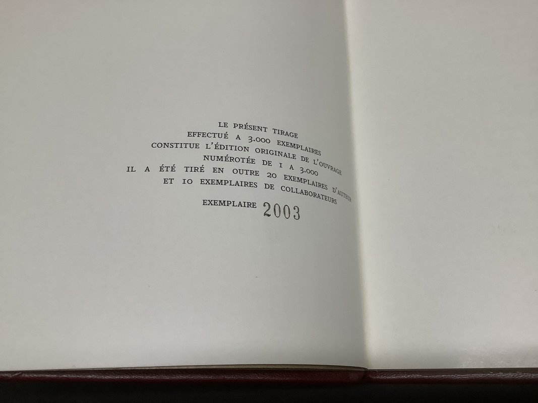 LIMITED EDITION of 3000 copies, this one numbered 2003. Tall 8vo [28cm x 18cm] in full maroon calf gilt, with raised bands and gilt line detail to spine, plus gilt emblem and line border to upper cover, with red cardboard slipcase; 159pp, with b/w illustrations throughout. Text in French. A clean copy with no previous ownership inscriptions or annotation. A few scuff marks to boards, spine a little rubbed and faded, light wear and fading to slipcase. Overall VG in a VG slipcase.
