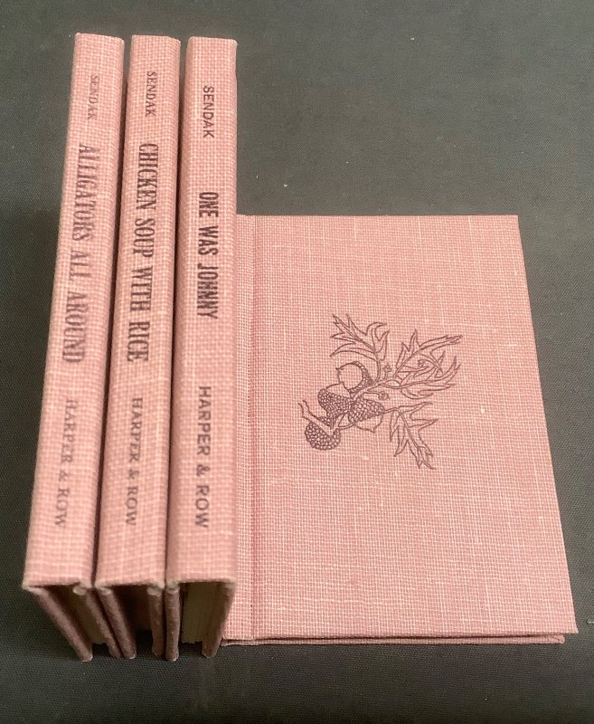 FIRST EDITION 4 small (approx. 9.4 x 6.7cm) pink cloth hardback volumes with brown titles to spine and oak leaf decoration to upper boards, all in dust jackets, within colour paper-covered slipcase. Each volume profusely illustrated charmingly in colour by the Author. A clean set with no previous owners' markings or inscriptions. Very slight fading to dust jacket spines, a few tiny chips to edges of the Pierre and Chicken Soup volumes and rather more to the remaining two, with some rubbing to spine of One Was Johnny (please see photos). Slight rubbing to corners of slipcase but overall a VERY GOOD SET in VERY GOOD SLIPCASE.