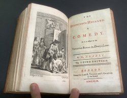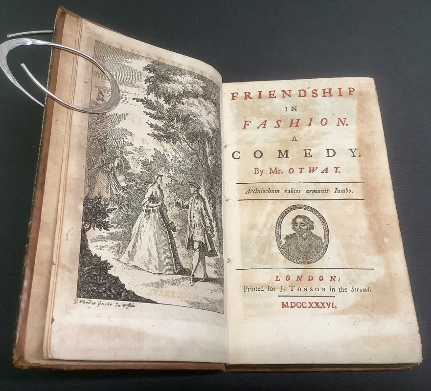 Small 12mo. (approx. 17 x 10cm) hardback in original 18th Century full calf, raised bands, title label, gilt, and gilt rules to spine and boards. 107pp. plus 1pp. Epilogue, with engraved frontispiece; 83pp. plus 1pp. Epilogue, with engraved frontispiece; 94pp. plus 2pp. Epilogue, with engraved frontispiece; 78pp. plus 2pp. Epilogue, with engraved frontispiece; [10], 70pp. plus 2pp. Epilogue, with engraved frontispiece. Cast Lists to all five plays. Contemporary ink initials to ffep. Occasional light foxing. Spine somewhat rubbed with faint cracks to upper surface of calf. Very light rubbing and scuffs to boards and corners (please see photos). Overall a Good Copy. This is one volume of a large collection of uniformly bound mainly 18th century collections of plays (generally 4 or 5 per volume) from the collection of the Vaughan Jenkins family of the Manor of Priston in Somerset. They were mostly bought at the time of publication in London (c.1713 - 1765, but some as early as 1655) and uniformly bound. Many of the volumes have the initials MCJ (Mary Caroline Jenkins, 1731-1790) or ED (Elizabeth Davis, nee Jenkins, 1736-1810) who were the daughters of Elizabeth Jenkins (1712-1766) and William Jenkins (1688-1774), who became Lord of the Manor of Priston in 1757 when the family moved from London. These books all remained at Priston until being inherited by the uncle of the vendor of the collection.
