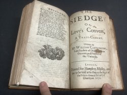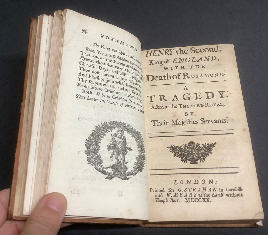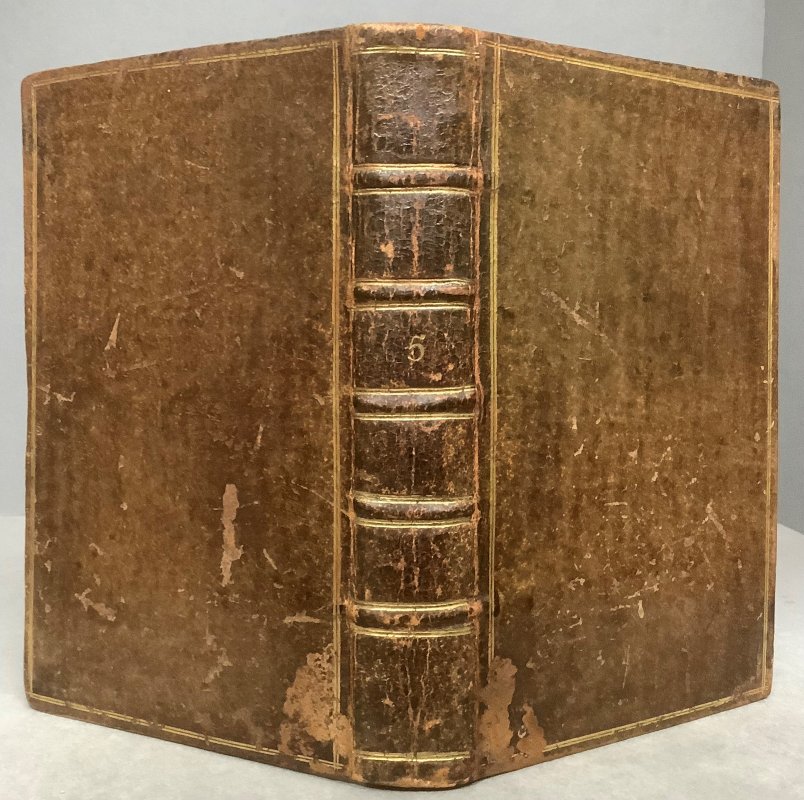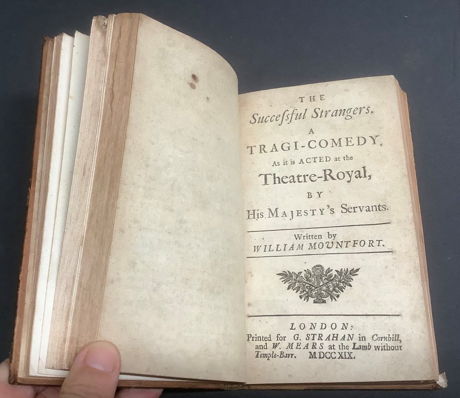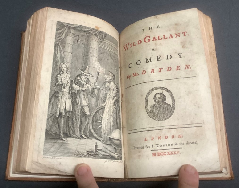 12mo. (approx. 16.7 x 9.6cm) hardback in original 18th Century full calf, raised bands, gilt rules and number 5 to spine, and gilt rules to boards. [4], 19pp., with engraved frontispiece; [2], pages numbered 25-74, with engraved frontispiece; [12], pages numbered 421-491; [16], pages numbered 97-176 including 2pp. Epilogue; 82pp., plus 2pp. Epilogue, with engraved frontispiece; [6], pages numbered 97-180. Cast Lists to second and third plays. Contemporary ink initials to ffep. The last play (Cartwright 1651) has occasional contemporary handwritten ink notes (and decorative scrolls) throughout, some illegible. It has also been trimmed rather tight to top and foredge with slight loss to top word of title page and to some of the handwritten notes at the foredge. Occasional light foxing and browning to pages, particularly second and fourth plays. Some light wear and rubbing to spine and boards with small areas of scuffing to top surface of calf at lower edge (please see photos). Overall a Good+ Copy. This is one volume of a large collection of uniformly bound mainly 18th century collections of plays (generally 4 or 5 per volume) from the collection of the Vaughan Jenkins family of the Manor of Priston in Somerset. They were mostly bought at the time of publication in London (c.1713 - 1765, but some as early as 1655) and uniformly bound. Many of the volumes have the initials MCJ (Mary Caroline Jenkins, 1731-1790) or ED (Elizabeth Davis, nee Jenkins, 1736-1810) who were the daughters of Elizabeth Jenkins (1712-1766) and William Jenkins (1688-1774), who became Lord of the Manor of Priston in 1757 when the family moved from London. These books all remained at Priston until being inherited by the uncle of the vendor of the collection.