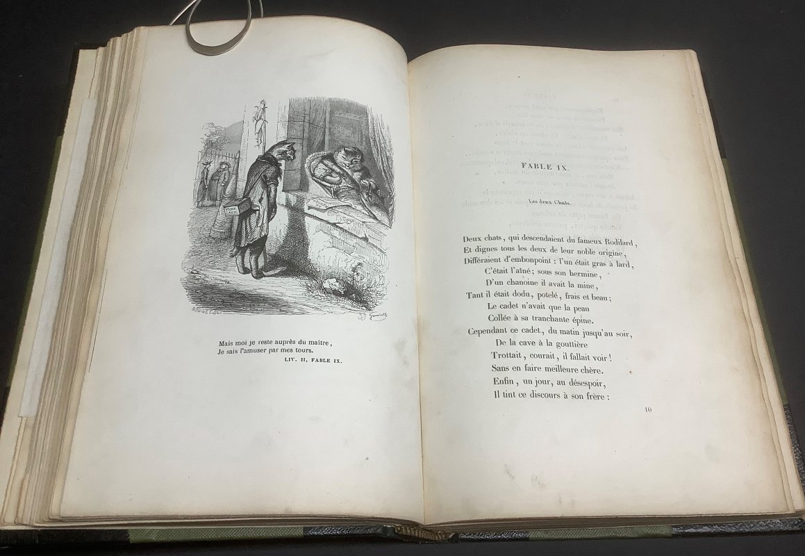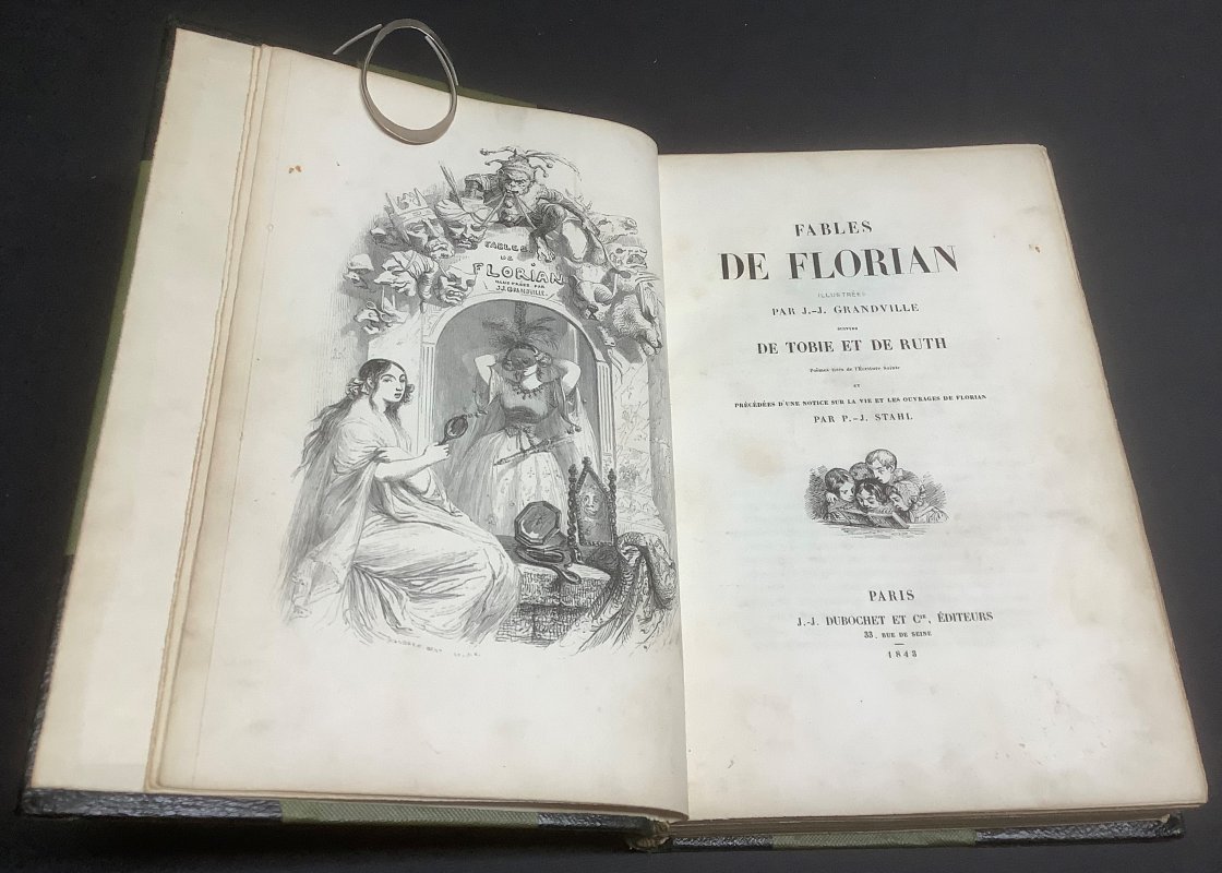 FIRST EDITION 8vo. rebound halfbound black leather and green cloth hardback, gilt. 292pp. with b/w steel-plate engravings by J. J. Grandville. Text in French. A clean copy with no previous owners' markings or inscriptions. Original attractive gilt cover and spine have been pasted to blank pages to rear. Very light wear to binding between rear endpapers. Very light edgewear to spine and corners of covers, as well as light scuffing to spine. A VERY GOOD COPY.