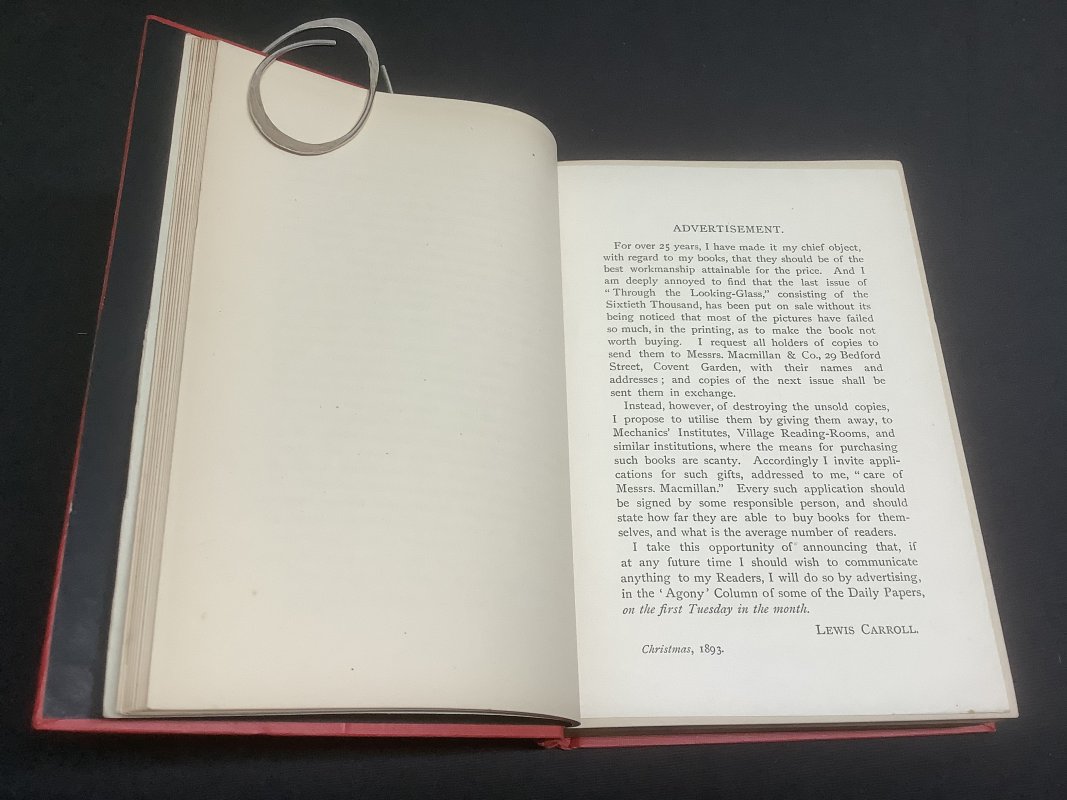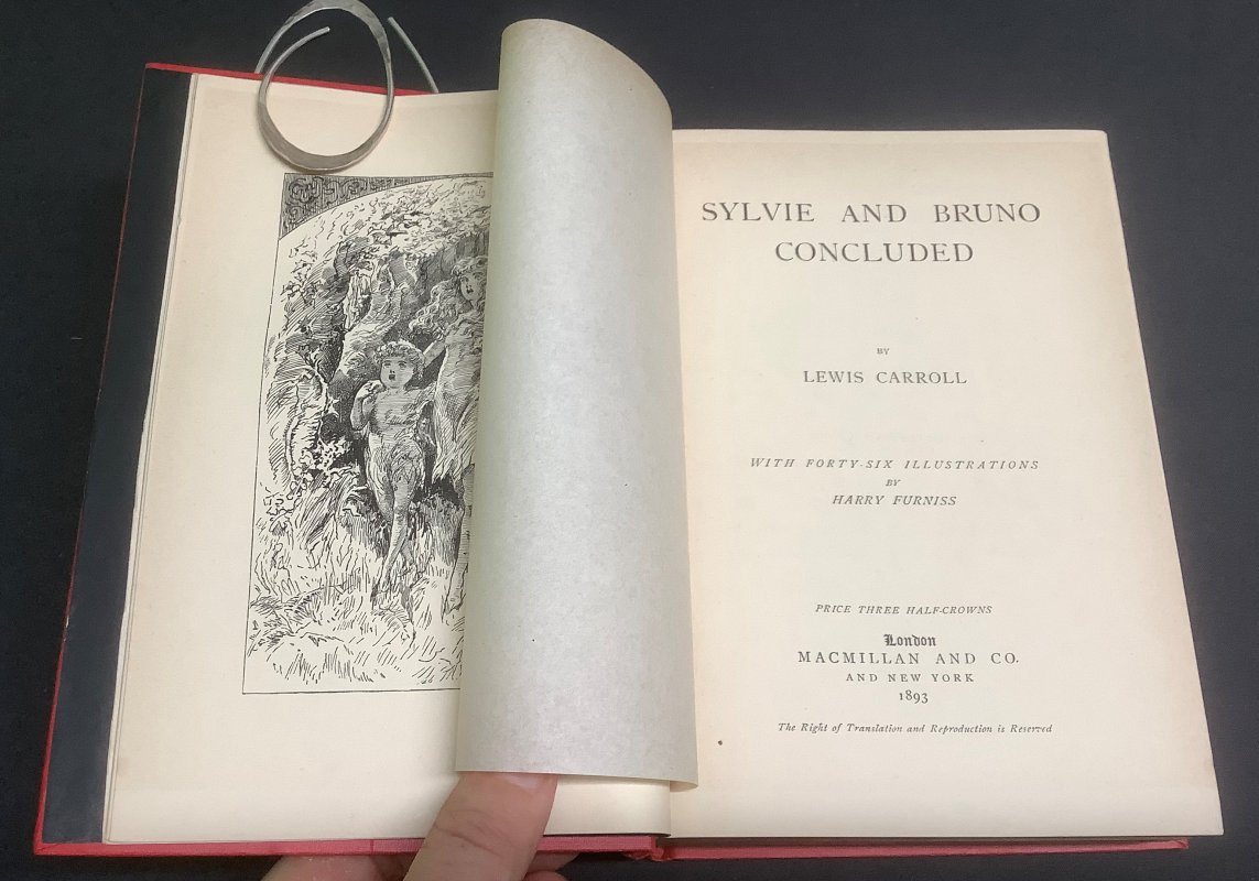 Volume II. 1893 FIRST EDITION. 8vo., rerd buckram-bound hardback gilt, with gilt emblems to upper and lower covers, a.e.g., [xxxi] + 423pp, indexed +2 blanks + 5pp Author's publications list, tissue-protected frontis, plus 46 b/w illustrations by Harry Furniss. Includes 1pp 'Advertisement' by Lewis Carroll, loosely inserted. A very clean copy with no previous ownership inscriptions or annotation. Light foxing to rear endpaper. Overall a VG, bright copy.