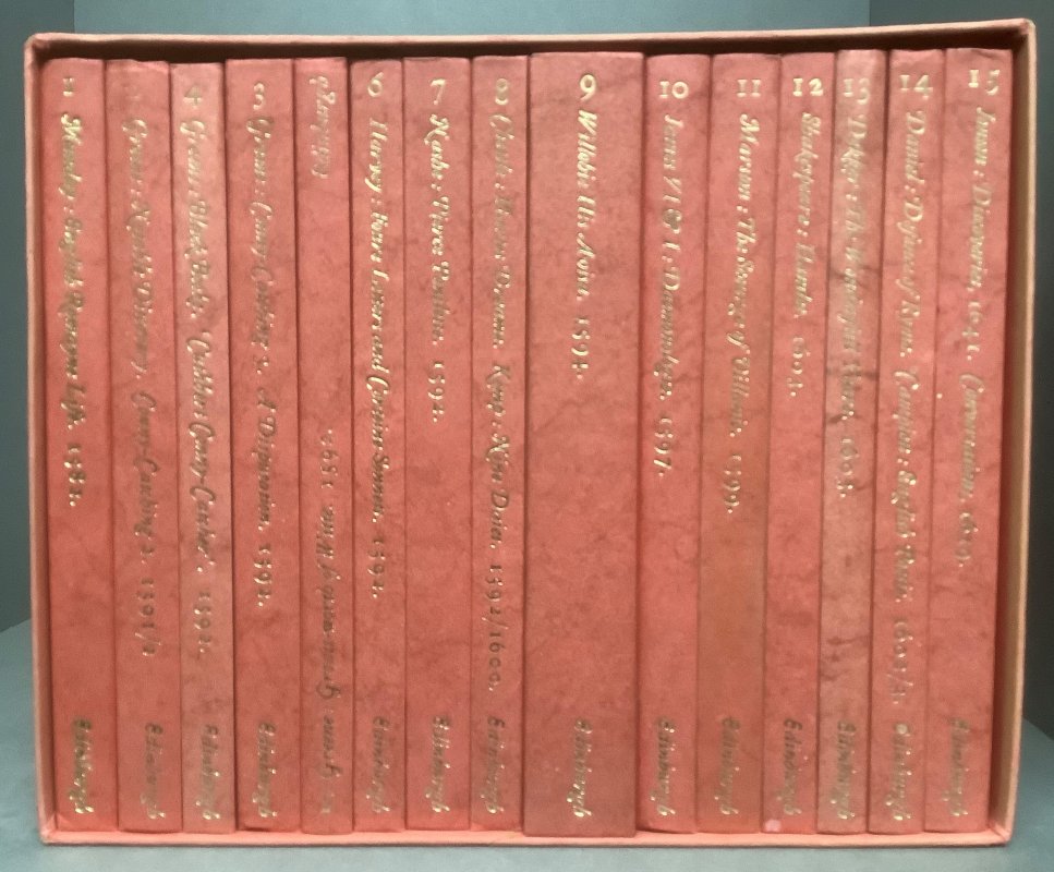 First Thus. 15 small 8vo volumes bound in red paper-covered boards gilt, with gilt lettering to upper covers, with red cardboard slipcase. A clean set with no previous ownership inscriptions or annotation. Spines uniformly slightly faded, slipcase also a little faded, with a few handling marks, some creasing to rear of case and a 5cm closed tear to base. Overall a VG set in a Good slipcase.