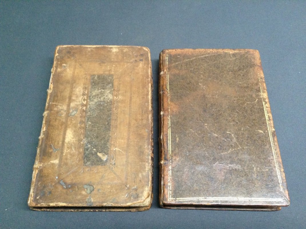 BOTH VOLUMES FIRST EDITION in unmatched bindings. 12mo. full calf hardbacks with raised bands, Vol. I lacking title label, with gilt decorations to spine and inlaid and blind-embossed decoration to boards; Vol. II has red title label, gilt, to spine and gilt borders to upper and lower boards with all edges speckled in red. 212pp. and 198pp. Vol. I has engraved frontispiece by Van der Gucht after Hogarth. Engraved armorial bookplate of Sir John Cope (1690-1760, British General and Member of Parliament) to front pastedown of Vol. II. Faint pencil marks to pastedowns of Vol. II with a few letters in ink to blank facing dedication page and rear pastedown. Occasional light foxing, heavier to prelims. Some wear and rubbing to bindings with front board loose (but still held by sewing) to spine of Vol. I and calf just starting to crack at upper hinge of Vol. II. Overall a Good Set.