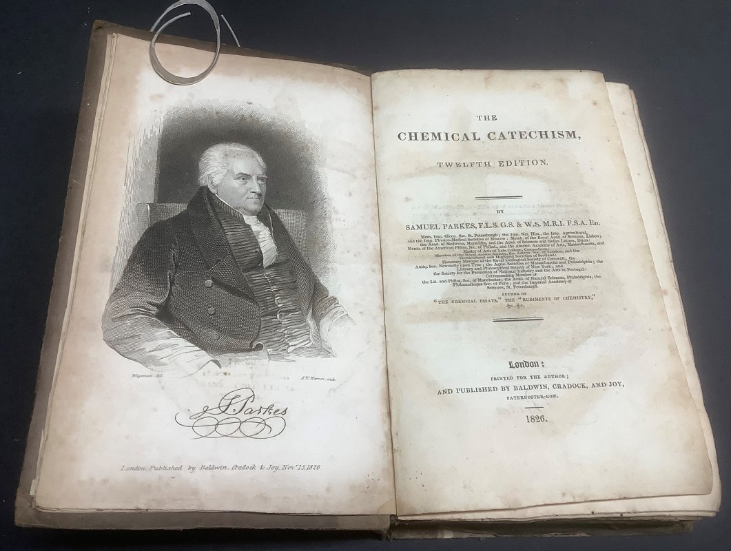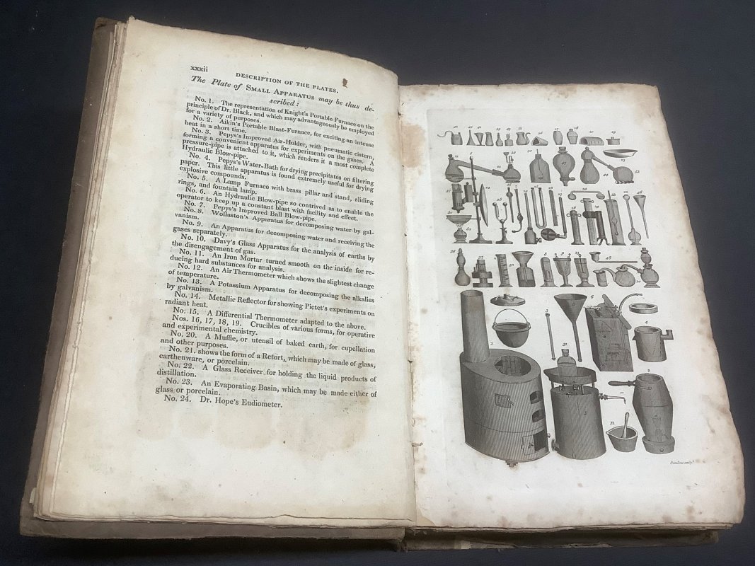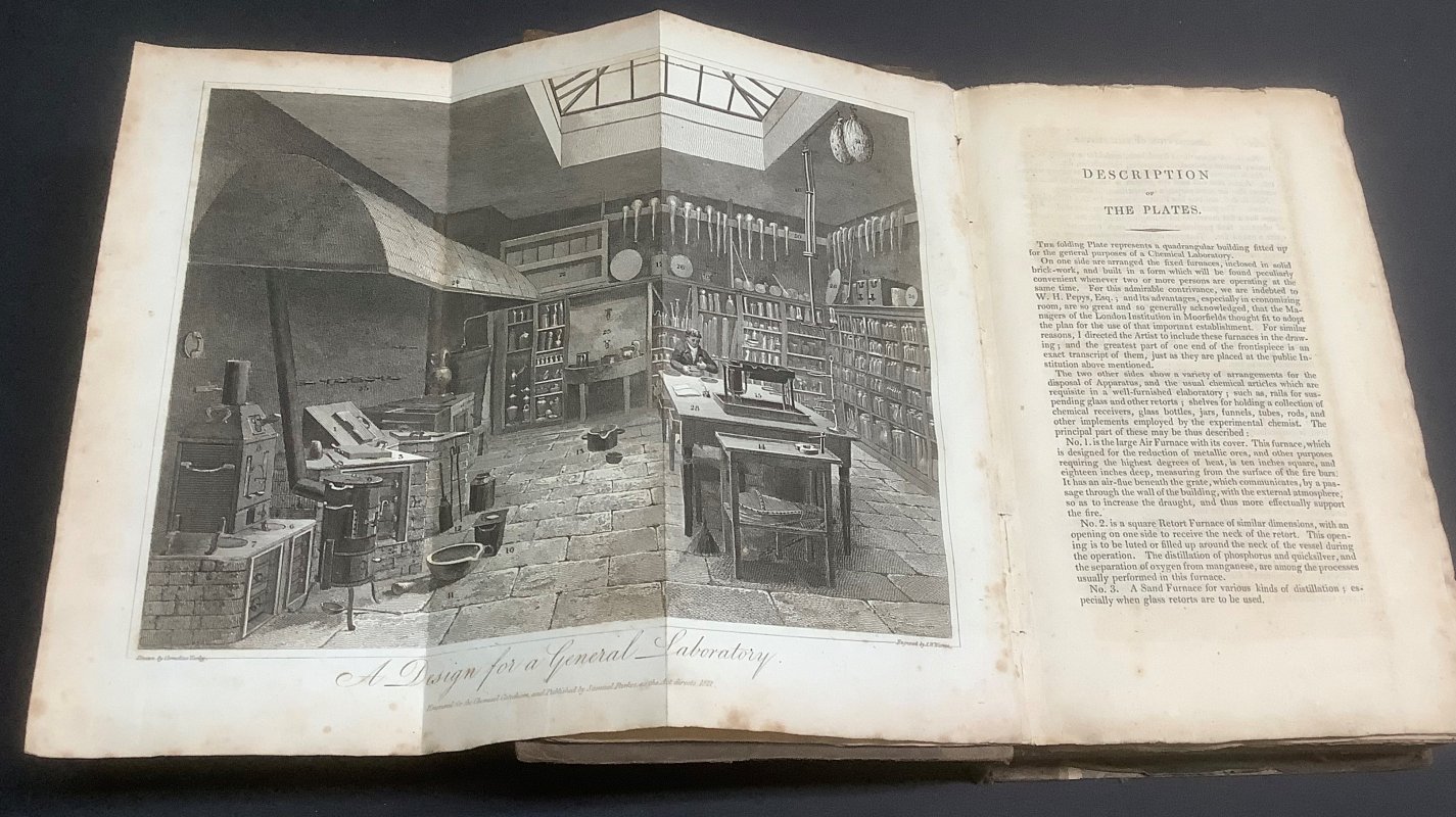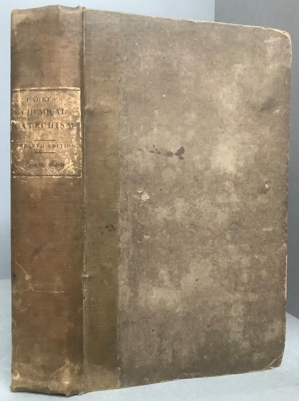 Twelfth Edition. 8vo., quarter bound in brown cloth with paper title label, over brown paper-covered boards; 7pp publisher's catalogue + [xxxiv] + 586pp., indexed, plus 2pp list of Author's works at end. Engraved portrait frontis, plus foldout engraved plate of the laboratory and one with 53 items of laboratory apparatus. Faint pencil inscription to ffep. Inner hinges rather stretched and splitting at endpapers, browning and foxing to edges, endpapers and throughout, boards rather rubbed and soiled with small holes and splits to foot of spine. A Sound study copy.
