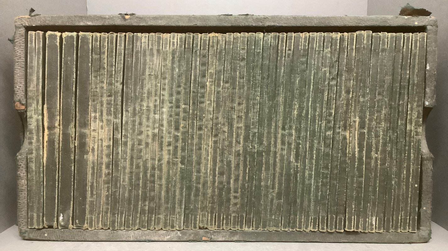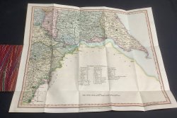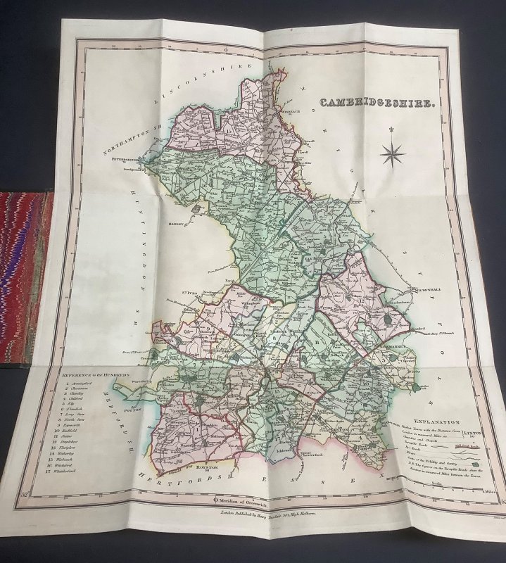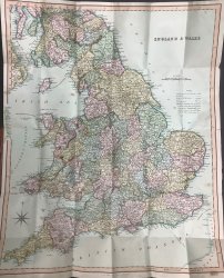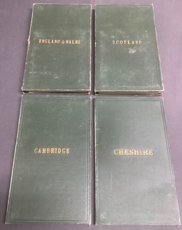 Dark green buckram-covered wooden box lined with marbled paper (approx. 18.5 x 34cm) containing 48 hand-coloured fold-out maps in dark green silk boards, gilt, with marbled endpapers. Comprising 45 County maps and 3 Country maps (England & Wales, Scotland, Ireland). Most covers a little worn and rubbed with slight fraying to spines but the maps themselves very bright and crisp. The exterior of the box is very worn with buckram covering peeling and/or missing in places but holds the maps together well. Overall a VERY GOOD COLLECTION OF FOLD-OUT MAPS, in rather tatty presentation box.