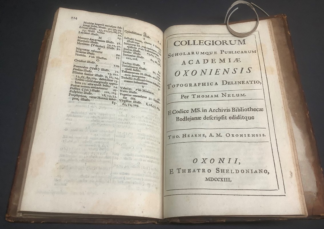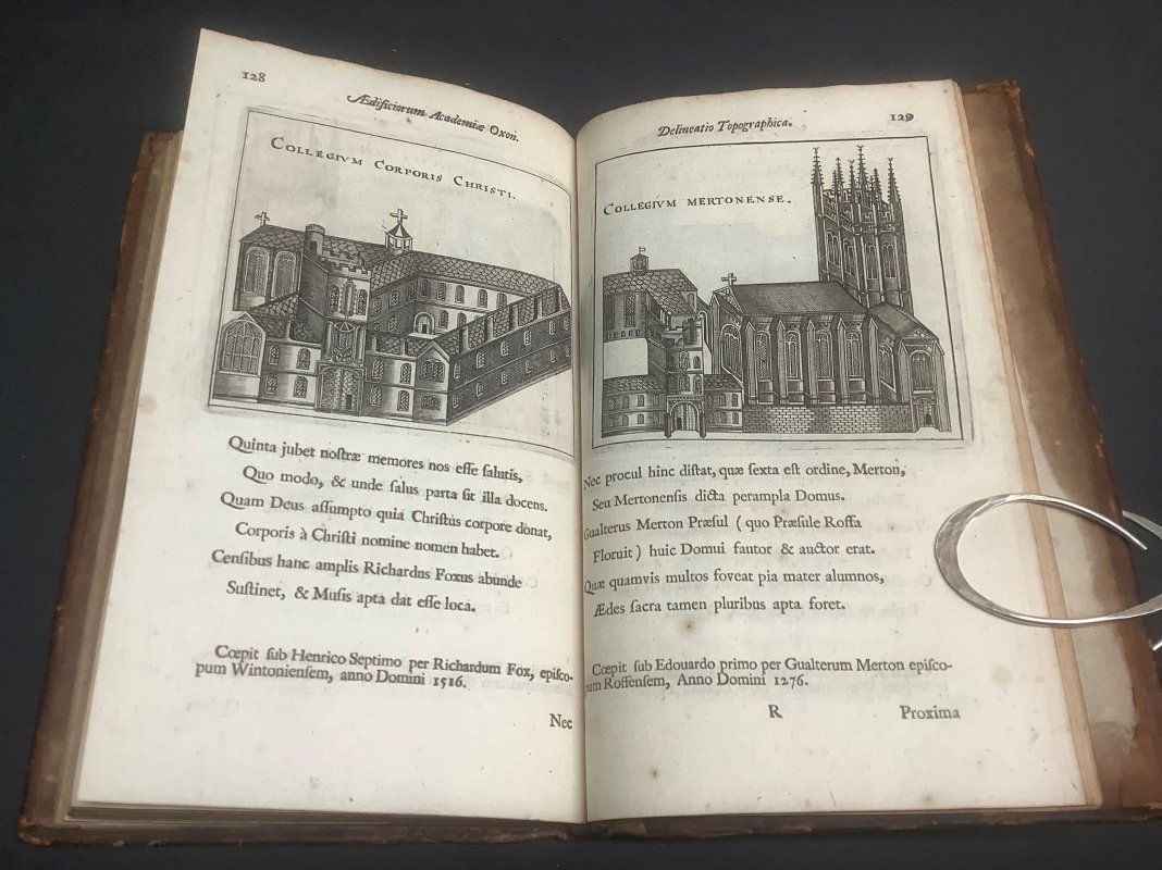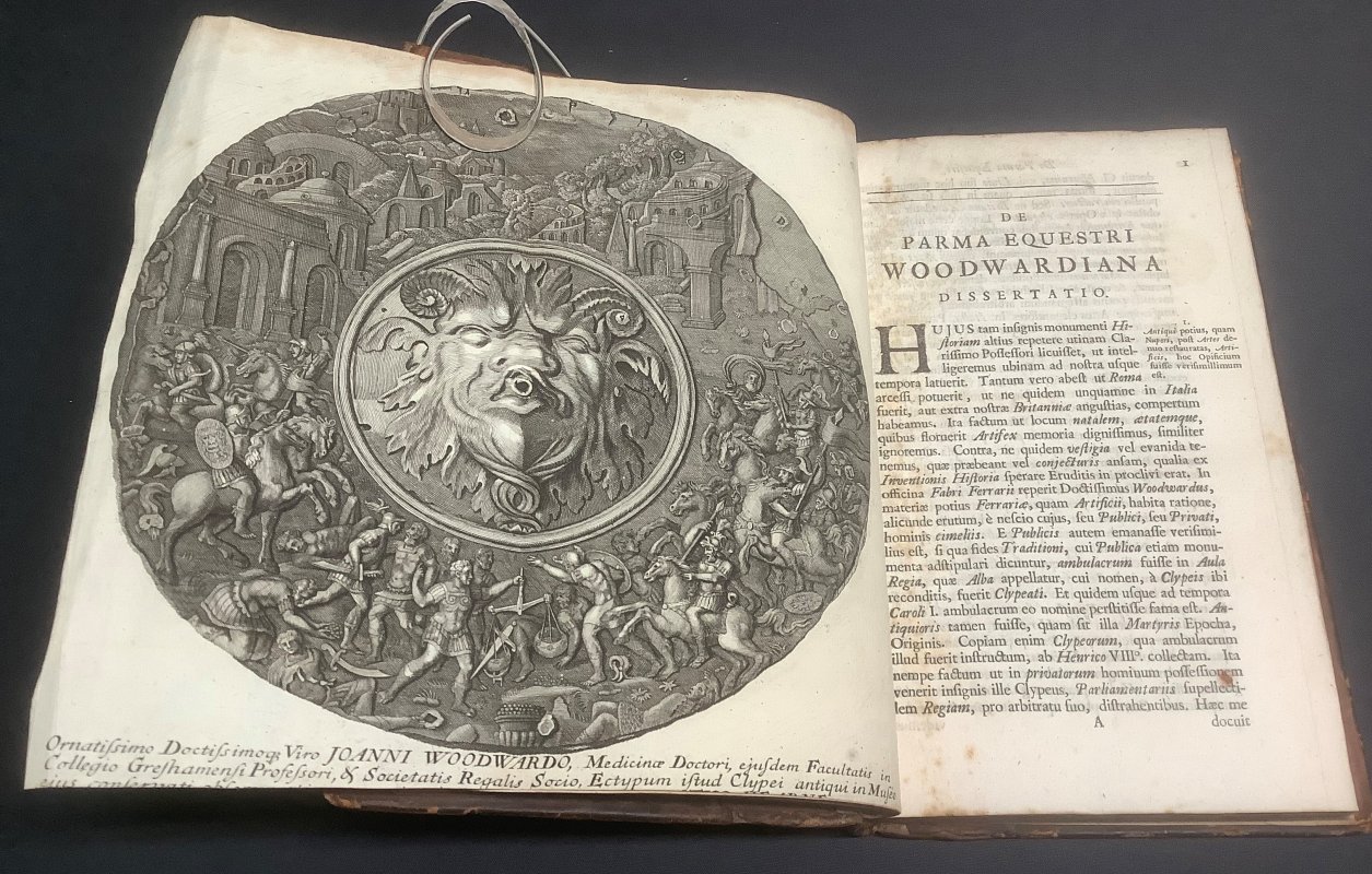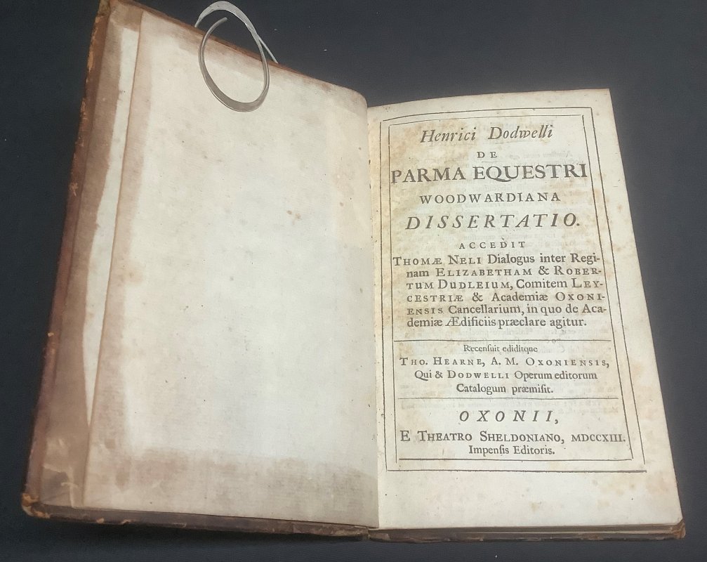 DE PARMA EQUESTRI WOODWARDIANA DISSERTATIO with COLLEGIORUM SCHOLARUMQUE PUBLICARUM ACADEMIAE OXONIENSIS TOPOGRAPHICA DELINEATIO Accedit Thomas Neli Dialogus inter Reginam Elizabetham & Robertum Dudleium, Comitem Leycestriae & Academiar Oxoniensis Cancellarium, in quo de Academiae Aedificiis praeclare agitur.