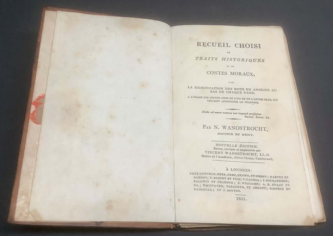 Nouvelle Edition 12mo. (approx. 18 x 11cm) hardback in full contemporary mottled calf, gilt rules to spine. 272pp. plus 4pp. Advertisements at end. Preface and footnotes in English, rest of Text in French. Ink signature to front pastedown and ink drawing of man to rear pastedown with corresponding hole cut in rfep (please see photo). Remains of red and black sealing wax to endpapers. First couple of gathers slightly loose. Faint varnish mark to lower board, else a VERY GOOD COPY externally, Good internally.