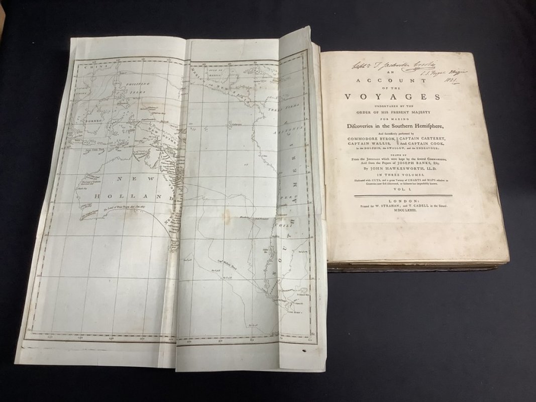 AN ACCOUNT OF THE VOYAGES UNDERTAKEN BY THE ORDER OF HIS PRESENT MAJESTY FOR MAKING DISCOVERIES IN THE SOUTHERN HEMISPHERE (3 Volumes) And successively performed by Commodore Byron, Captain Wallis, Captain Carteret, and Captain Cook, in the Dolphin, the Swallow, and the Endeavour: Drawn up from the Journals which were kept by the several Commanders, and from the Papers of Joseph Banks Es