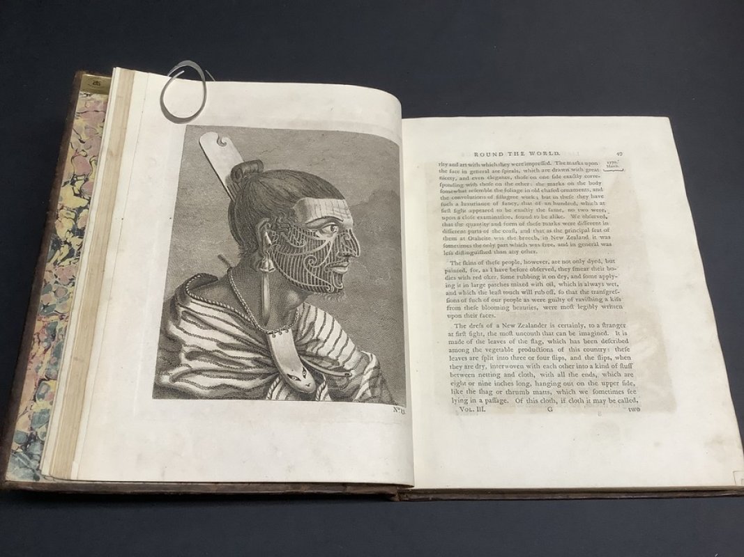 Second Edition. Three Volumes. 4to. (approx. 30 x 23.5cm) hardbacks in full, contemporary tree calf, rebacked using original spines with red title labels, dark green volume labels and highly decorative gilt, in modern brown clothbound slipcases. Marbled endpapers. 456, 410 and 395pp. All volumes illustrated with charts and plates, many folding. 48 of 52 plates present (Vol. I lacking Plate 22 and Vol. II lacking Plates 1, 3 and 7). Each volume has ink inscription of Capt. T. Sackville Crosbie, C. S. Frigate O'Higgins, 1821 to top of title pages (The First Chilean Navy Squadron flagship was the C. S. O'Higgins under Captain Thomas Sackville Crosbie). Occasional pencil notes in margins and to blanks in Crosbie's hand. Ink smudges to margins of pages ii and iii of Vol. Some charts a little creased but generally in very good condition. Some damage and small areas of loss to spines of Vols. I and II. Light rubbing to boards. Overall a GOOD+, HANDSOME SET.