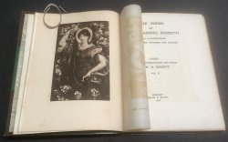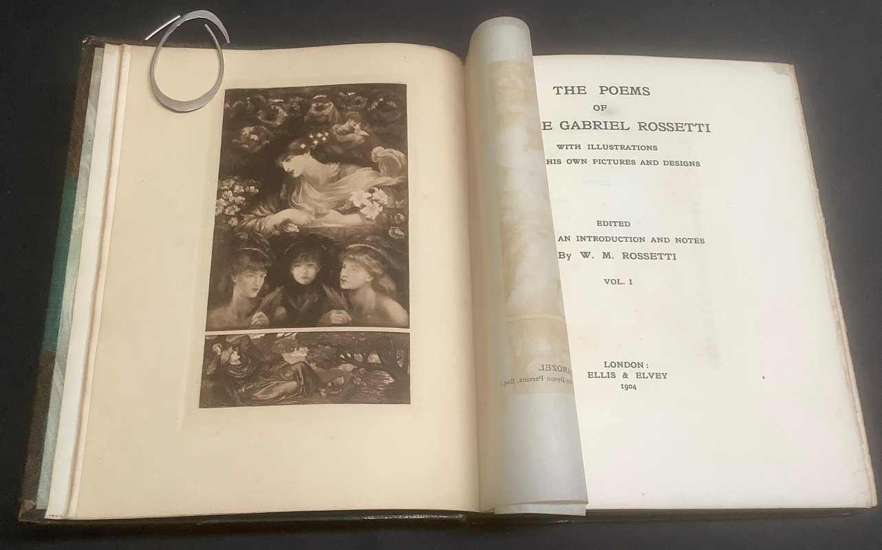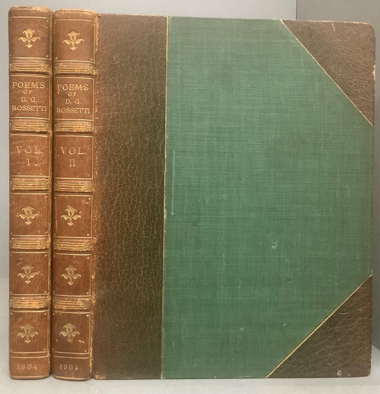 FIRST THUS 2 Volumes. 8vo. (approx. 22 x 17cm) hardbacks, half bound in brown morocco with raised bands, decorative gilt to spines, and green cloth-covered boards. t.e.g. 227pp. and 246pp. Both volumes illustrated with captioned, tissue-guarded sepia plates, all featuring works by Rossetti himself. Ink gift inscription to verso of marbled ffep, dated 1908. Occasional light foxing, mainly to tissue-guards of plates. Light wear and rubbing to spines and corners plus some scuffing to lower board of Volume I. Overall a Good Set.