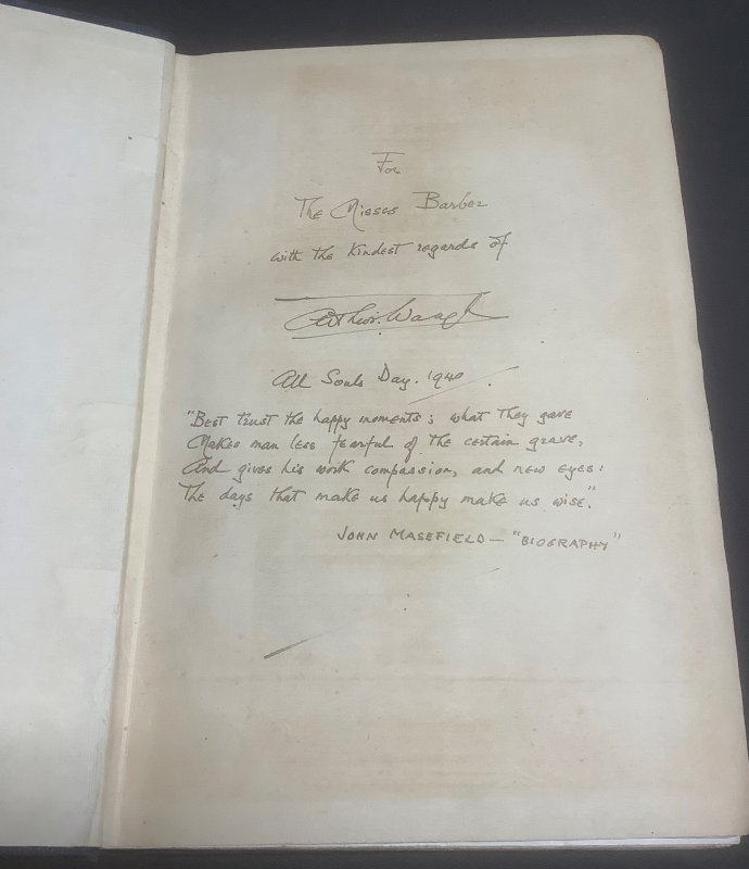 Cheap Edition, SIGNED, PRESENTATION COPY. 8vo. dark blue cloth hardback, gilt. 390pp., Indexed, illustrated with 26 b/w plates including frontispiece. Ink inscription to The Misses Barber, along with four lines of verse from John Masefield's