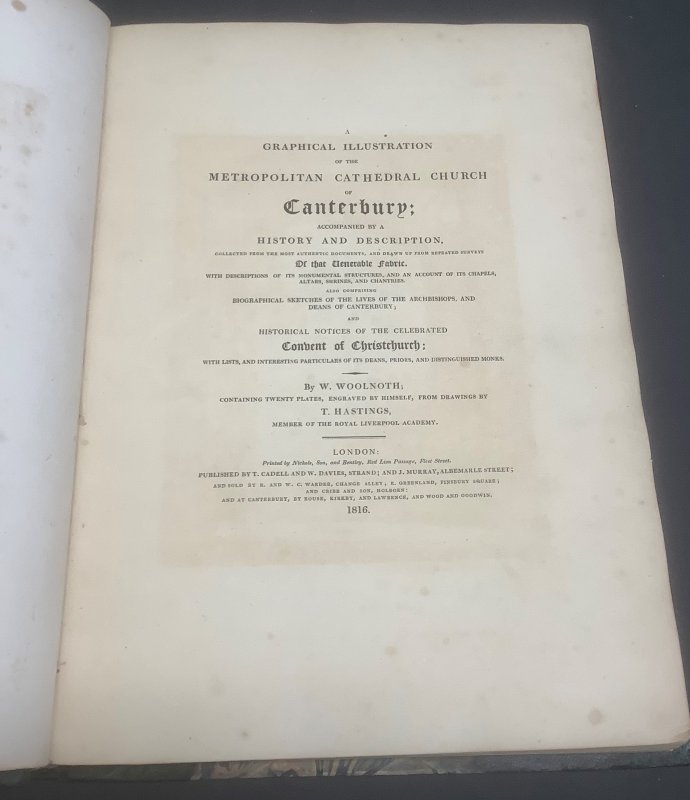 A Graphical Illustration of the Metropolitan Cathedral Church of Canterbury; Accompanied by a History and Description, Collected from the most Authentic Documents, and Drawn up from Repeated Surveys of that Venerable Fabric. With Descriptions of its Monum Containing Twenty Plates, Engraved by Himself, from Drawings by T. Hastings. (Bound with 2 copies of each engraving, 40 in total, Proofs and Etchings)