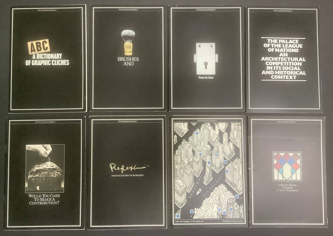 PENTAGRAM PAPERS: Nos. 1,3,4,5,6,7,8,9 (8 Volumes) A Dictionary of Graphic Cliches; Brushes and. Brooms; Face to Face; The Palace of the League of Nations; Would you Care to Make a Contribution?; Regazzini: Photographs of Bomarzo; Views from Pentagram, 212 5th Avenue, NY; Unilever House: Toward a New Orna