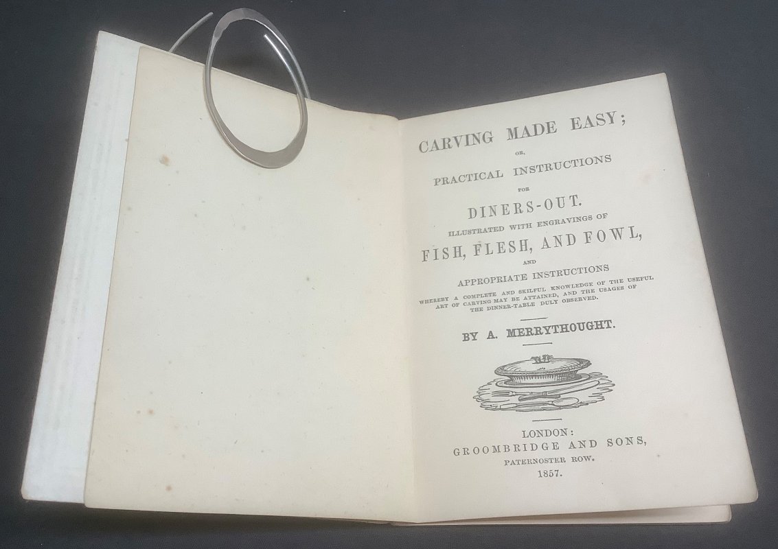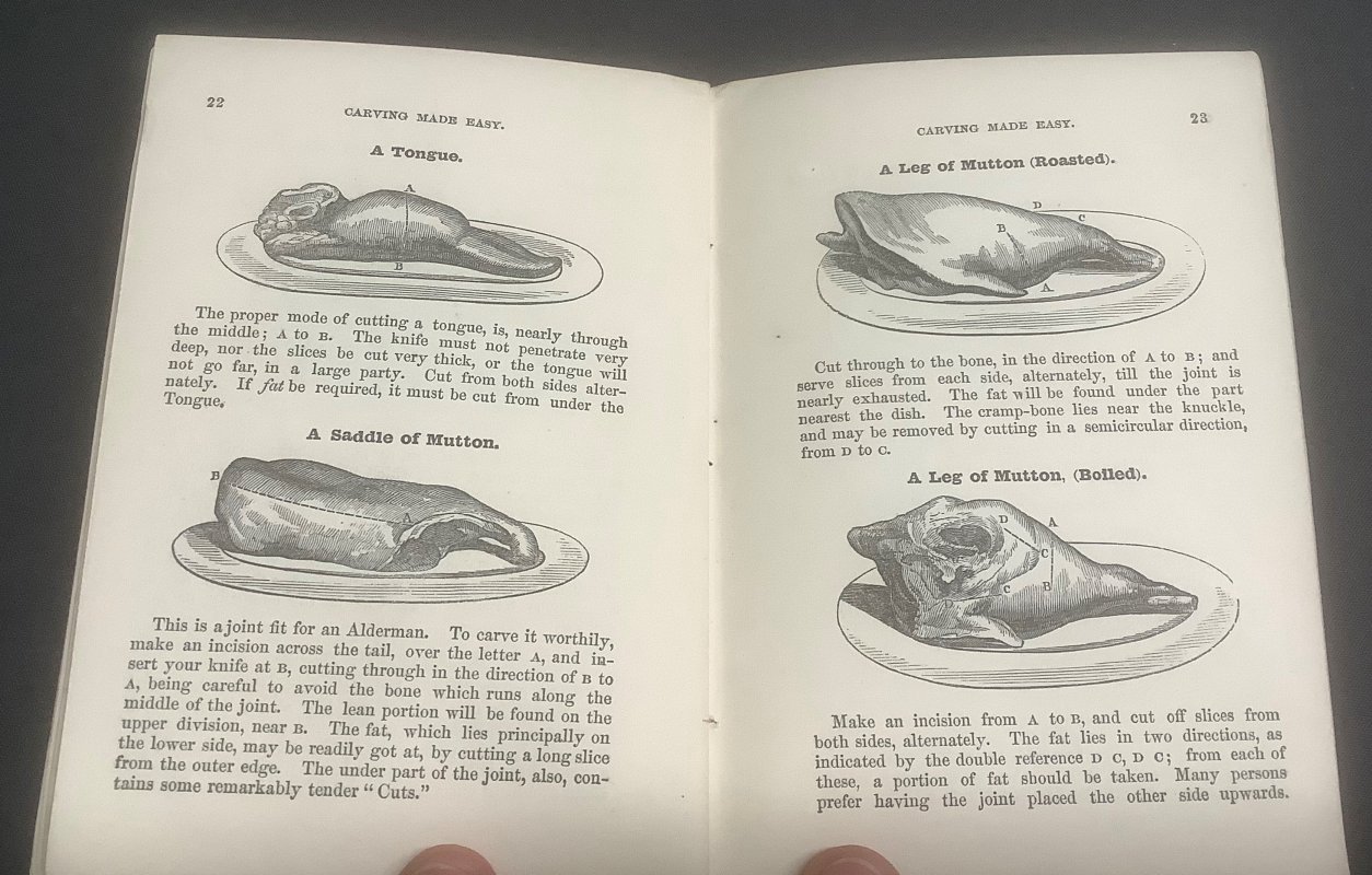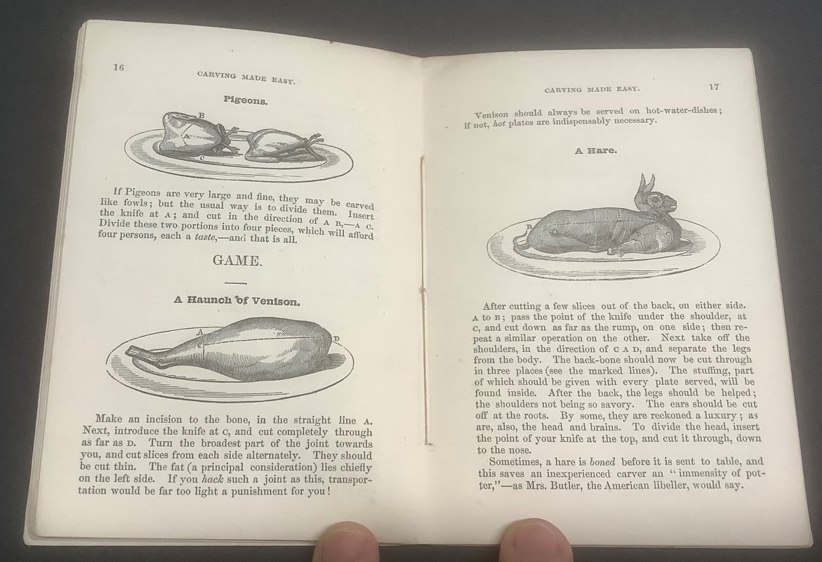 FIRST EDITION 16mo. (approx. 13 x 9cm) softback with original red card covers, gilt title to front cover and blind-embossed borders. 32pp., profusely illustrated with vignette engravings of meat, game and fish, ready to be carved. A clean copy with no previous owners' markings or inscriptions. A few small spots of soiling to covers, else a VERY GOOD COPY.