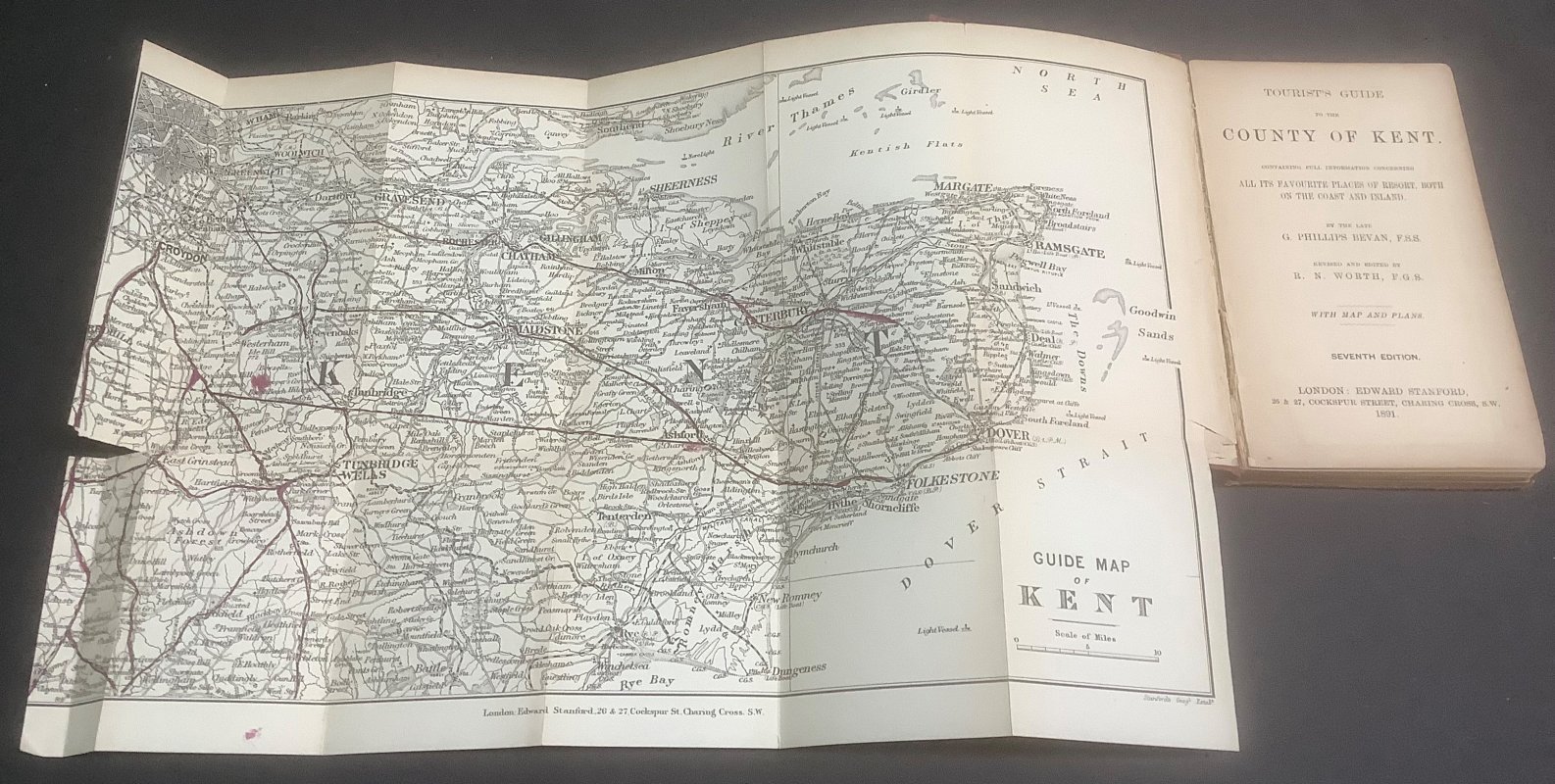 Seventh Edition. 12mo., tan clothbound hardback gilt,with gilt letters to upper cover; 151pp + 32pp contemporary adverts, with two black and white cathedral plans (one foldout, detached but present), plus foldout map of Kent. Previous owner's bold pencil inscription to ffep, old newspaper cutting fixed to rear pastedown, very occasional annotation to text, some of the railways on the foldout map appear to have been hand-inked in red. Binding a little fragile, front inner hinge very stretched, prelims and a few internal pages a little worn and torn at edges, a few short closed tears to the map. Covers worn at corners and spine ends. Good overall.