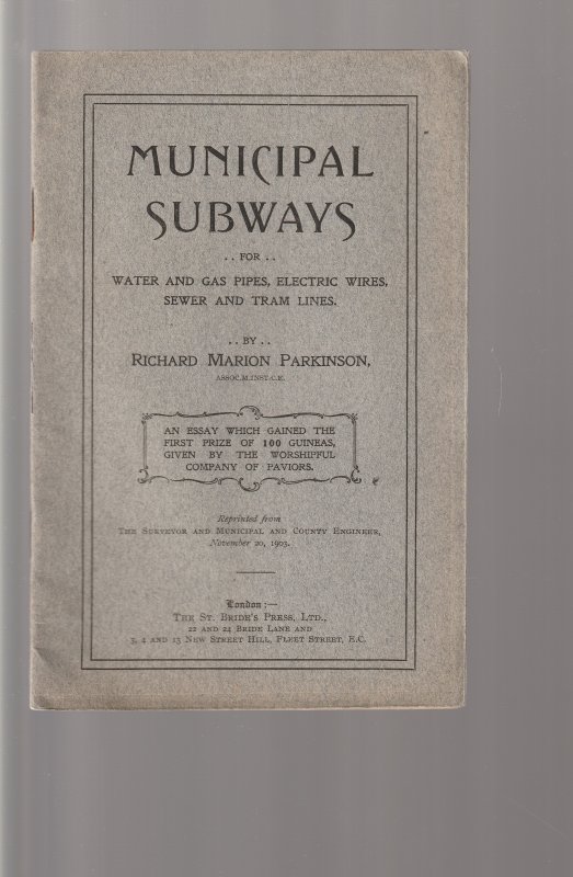 MUNICIPAL SUBWAYS FOR WATER AND GAS PIPES,ELECTRIC WIRES,SEWER AND TRAM LINES. An Essay Which Gained The First Prize of 100 Guineas, Given By The Worshipful Company of Paviors. Reprinted from The Surveyor and Municipal and County Engineer, November 20, 1903.