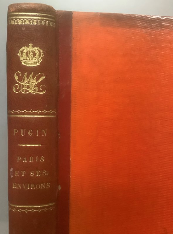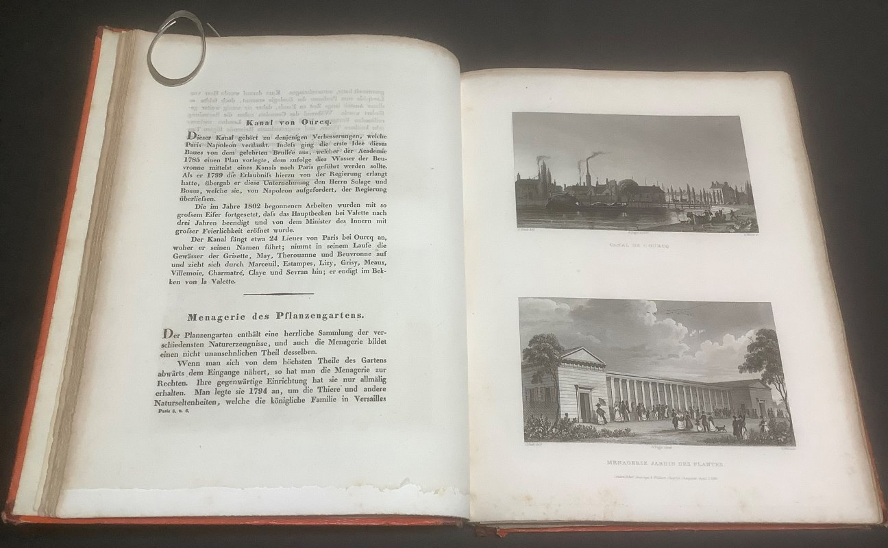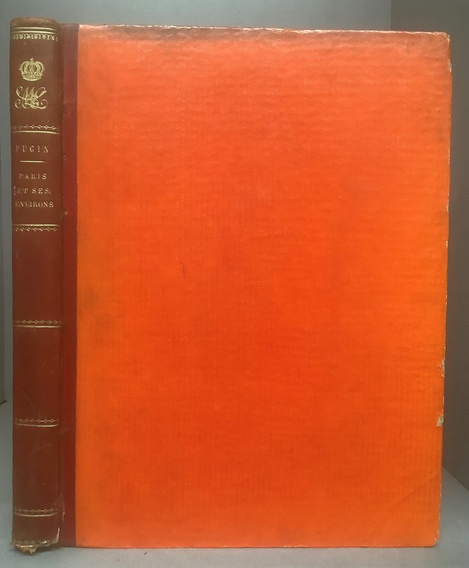 4to. hardback, quarter bound with spine in red morocco with decorative gilt and orange textured paper-covered boards. Crowned monogram of Empress Marie Louise (Napoleon's second wife) in gilt to top of spine. TEXT IN GERMAN. Pages unnumbered. Title page plus second engraved title page. 2pp. Contents (in German and French), large folding Map of Paris followed by 100 engravings (2 to a page, mostly with tissue guards) and captions in German on separate pages in between. Large pencil name and date (1938) to ffep and pencil notes concerning the book having come from the Library of the Empress Marie Louise to front pastedown. Slight browning to page edges and occasional light foxing. Damage to spine at base and edges with some old worming and loss (please see photos). Small chips to edges of orange paper-covered boards and light soiling. Overall a Good Copy.