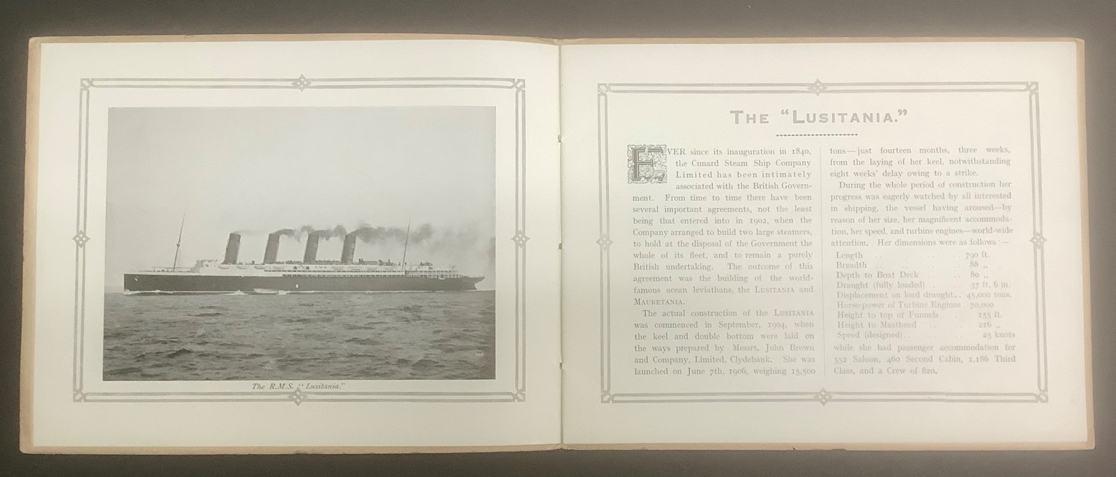 THE FAMOUS CUNARD LINER "LUSITANIA" R.M.S. Lusitania: Launched June 7 1906. Torpedoed by German Submarine May 7 1915.