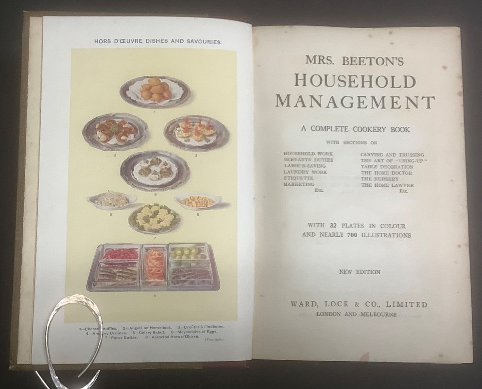 MRS BEETON'S HOUSEHOLD MANAGEMENT: A Complete Cookery Book with Sections on Household Work, Servants' Duties, Labour-Saving, Laundry Work, Etiquette, Marketing, Carving and Trussing, The Art of "Using-up", Table Decoration, The Home Doctor, The Nursery, T With 32 Plates in Colour and nearly 700 Illustrations.