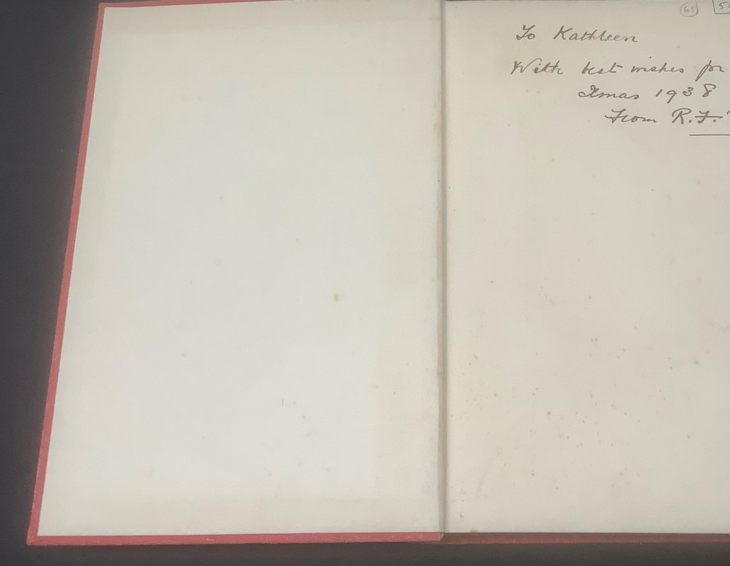 Third Impression (corrected and amended) 8vo. red cloth hardback, black titles to spine. Lacking dust jacket. 320pp. Ink gift inscription, dated 1938, to ffep. Occasional light foxing, heavier to prelims, first few pages and foredge. Slight forward lean. Upper board lightly faded, spine more so with foxing (please see photos). A few small holes to edge of lower spine and lower board, possibly old silverfish damage. Overall a Good Copy.