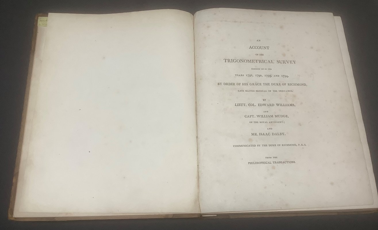 AN ACCOUNT OF THE TRIGONOMETRICAL SURVEY CARRIED ON IN THE YEARS 1791, 1792, 1793, AND 1794 by Order of His Grace the Duke of Richmond + AN ACCOUNT OF THE TRIGONOMETRICAL SURVEY CARRIED ON IN THE YEARS 1795 and 1796 by Order of the Right Honourable the Ma Communicated by the Duke of Richmond from the Philosophical Transactions. (2 Volumes bound in 1)