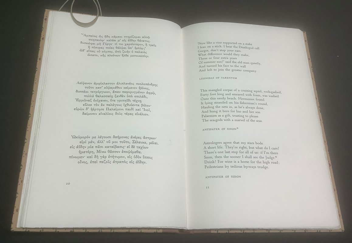 FIRST THUS 8vo. hardback in quarter brown cloth, gilt, with patterned paper-covered boards. t.e.g. Untrimmed foredge. Comparative text in Greek and English. 47pp. Pencil notes to top of p.3 only. A VERY GOOD COPY.