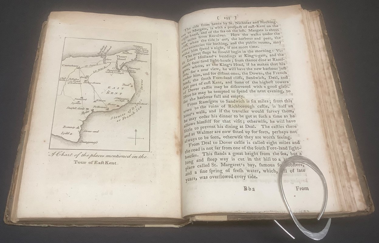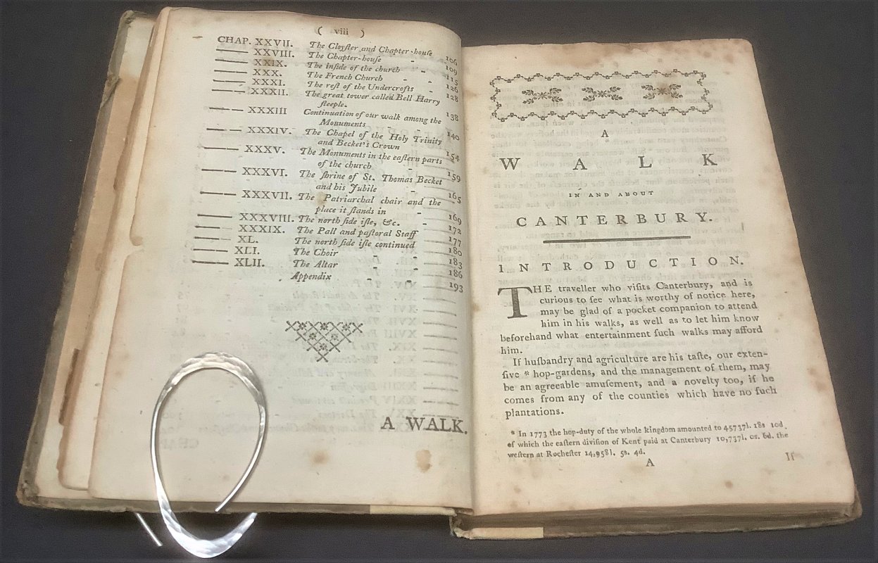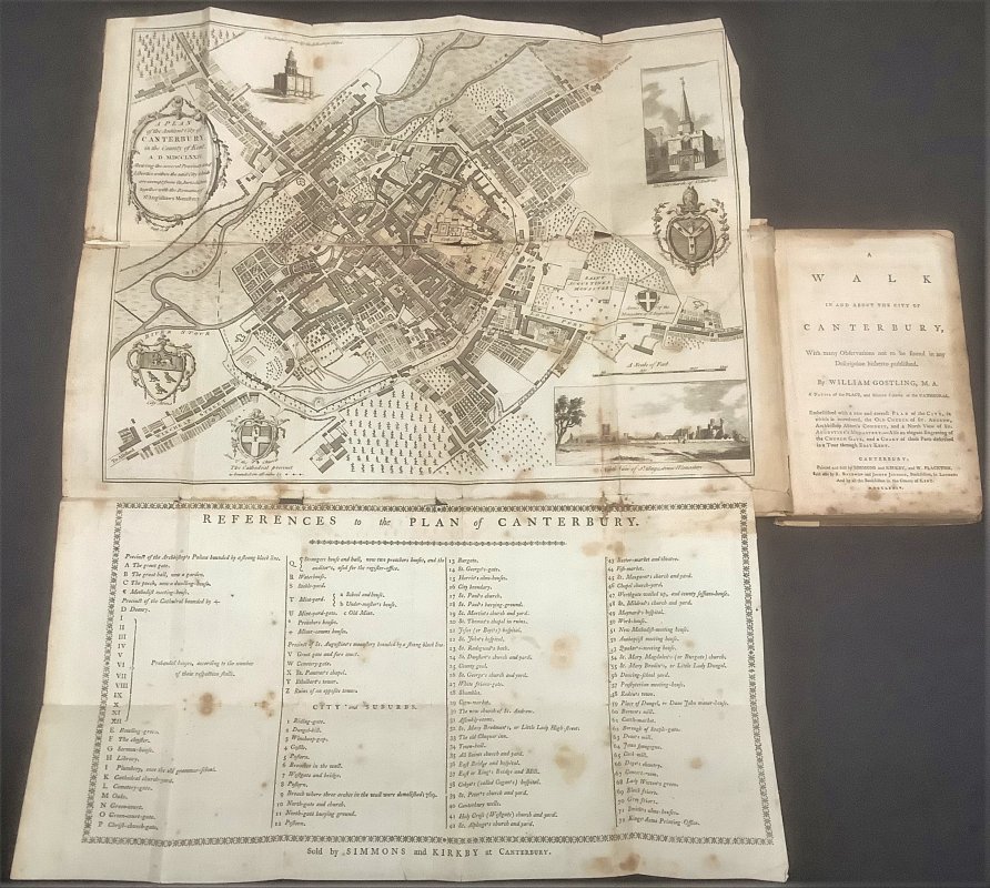FIRST EDITION Small 8vo. hardback with clumsily reinforced cream linen spine over original dark brown calf title label, gilt, and original brown boards. viii, 238pp. including Index and Errata (last 4 pages misnumbered 135-138 instead if 235-238). With large fold-out Plan of Canterbury, full page engraving of Christ Church Gate, Canterbury, Map of East Kent and plan of the Cathedral stained glass windows with Key. Old ink name (crossed out) pencil name s and address and dark red rubber-stamped name to front pastedown. Occasional light pencil notes in margins. Some light foxing throughout, occasionally heavy, particularly to prelims. Plan of Canterbury rather foxed and damaged with repairs inmatching cream linen tape to spine. Original boards rather soiled and rubbed, with edge wear (please see photos). Overall a Good, Sound Copy.