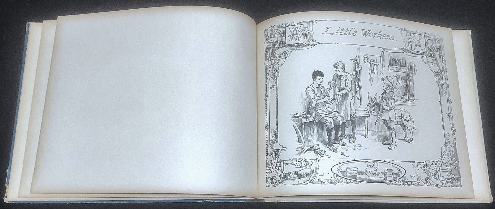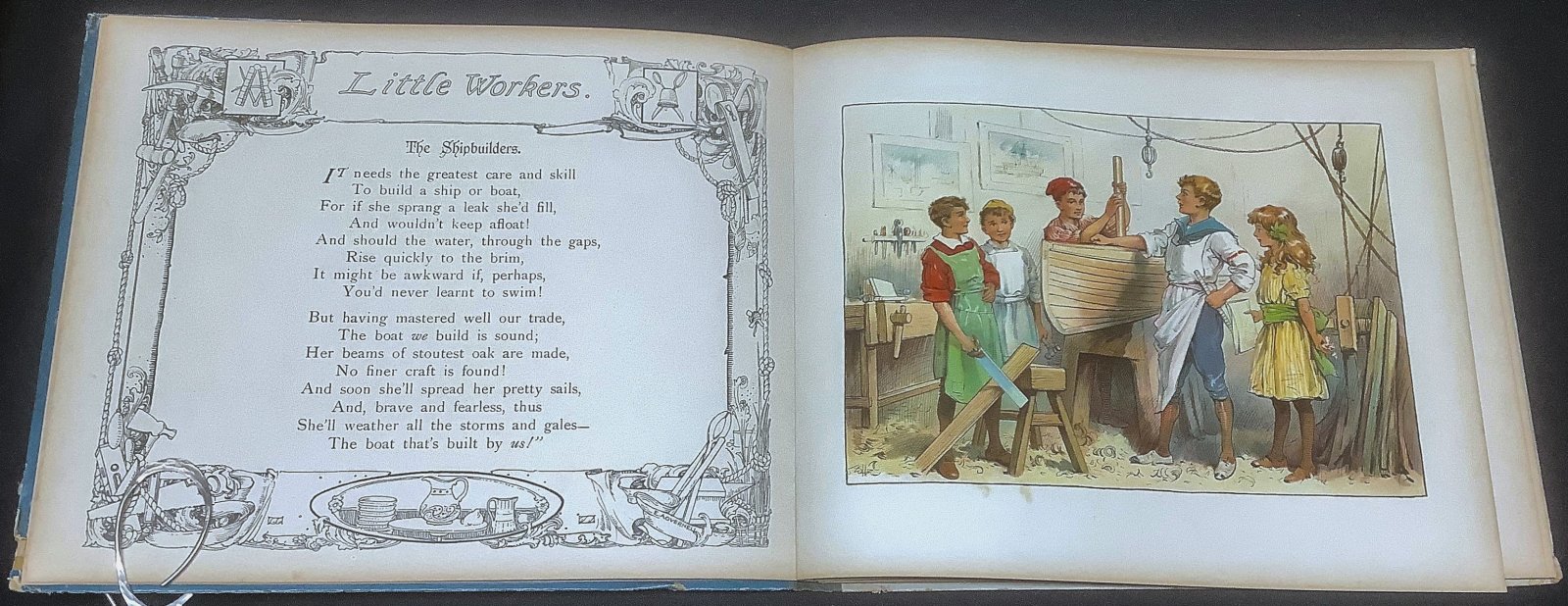 No Edition Stated. Landscape 4to. hardback with grey/blue cloth spine and illustrated laminated boards. Pages unnumbered. Contains 8 full-page colour plates and many b/w vignette illustrations and poems within decorative borders. Ink gift inscription (dated 1919) to front pastedown and ink initials to ffep. Occasional light foxing. Light soiling to lower board. Some edgewear to boards, particularly upper board which has small dent to lower edge and damage to lower corner (please see photos). Overall a GOOD+ COPY.